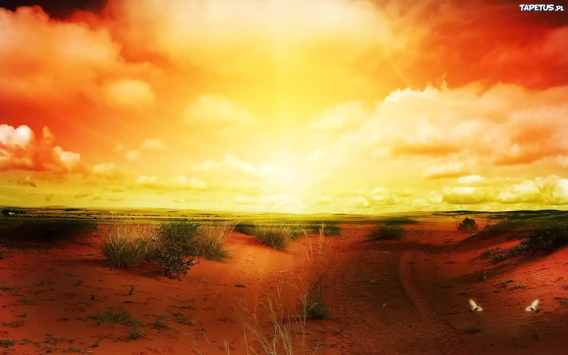 Tapeta Zachód, Słońca, Chmury, Pustynia, Rośliny
