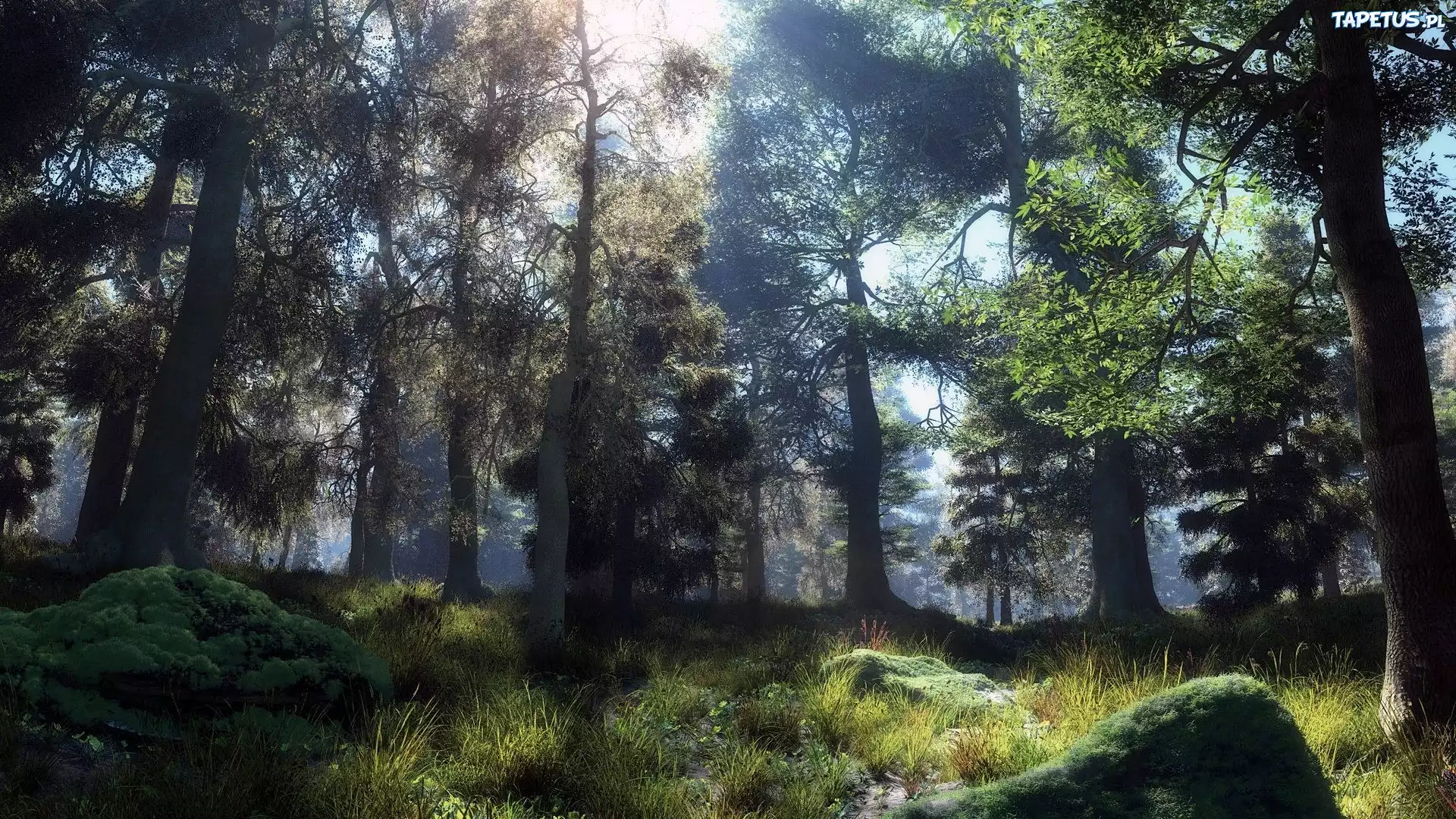 Tapeta Krajobraz, Las, Drzewa, Iglaki, Promienie, Słońca