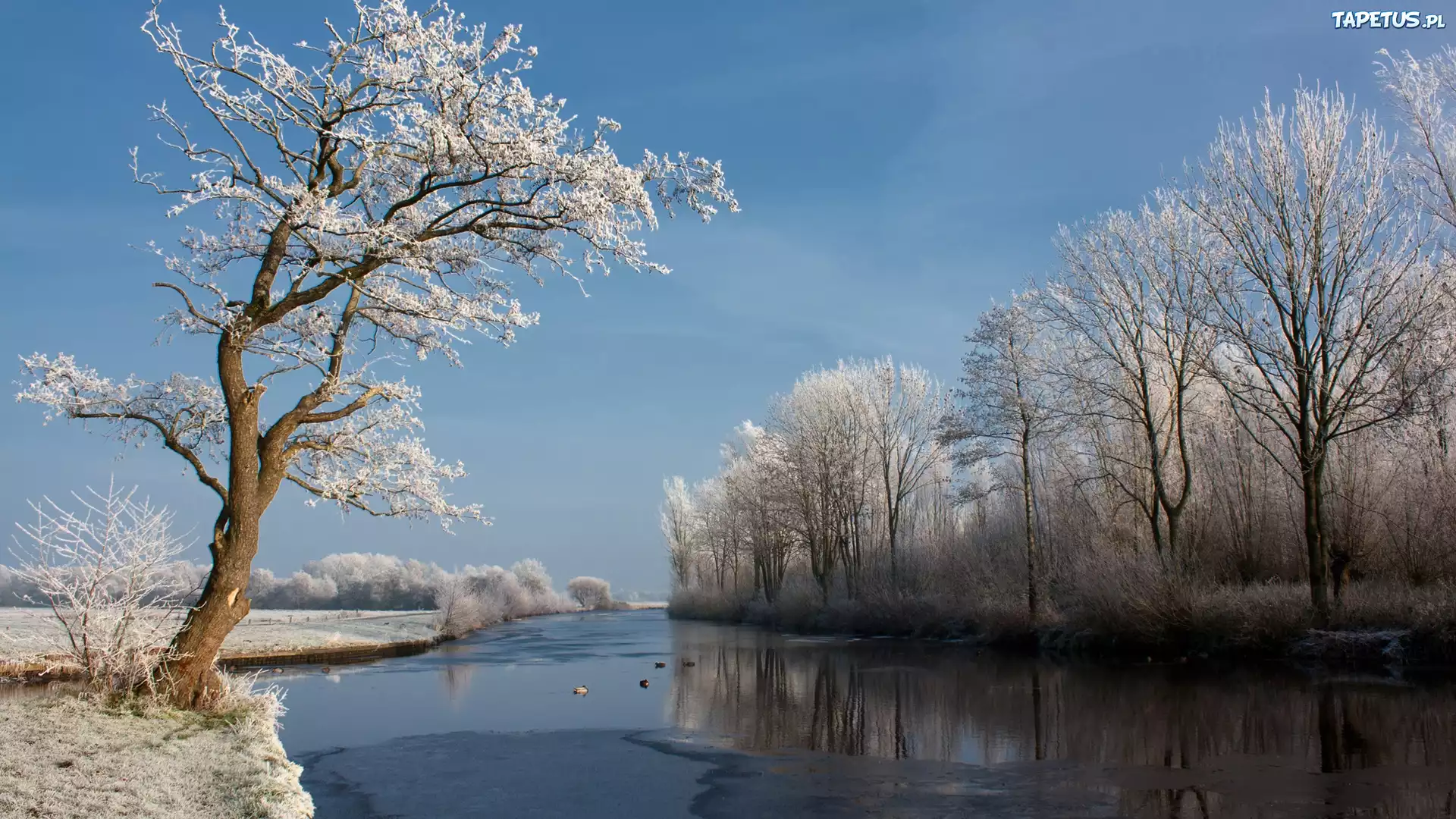 Tapeta Rzeka, Drzewa, Zimowy, Widok