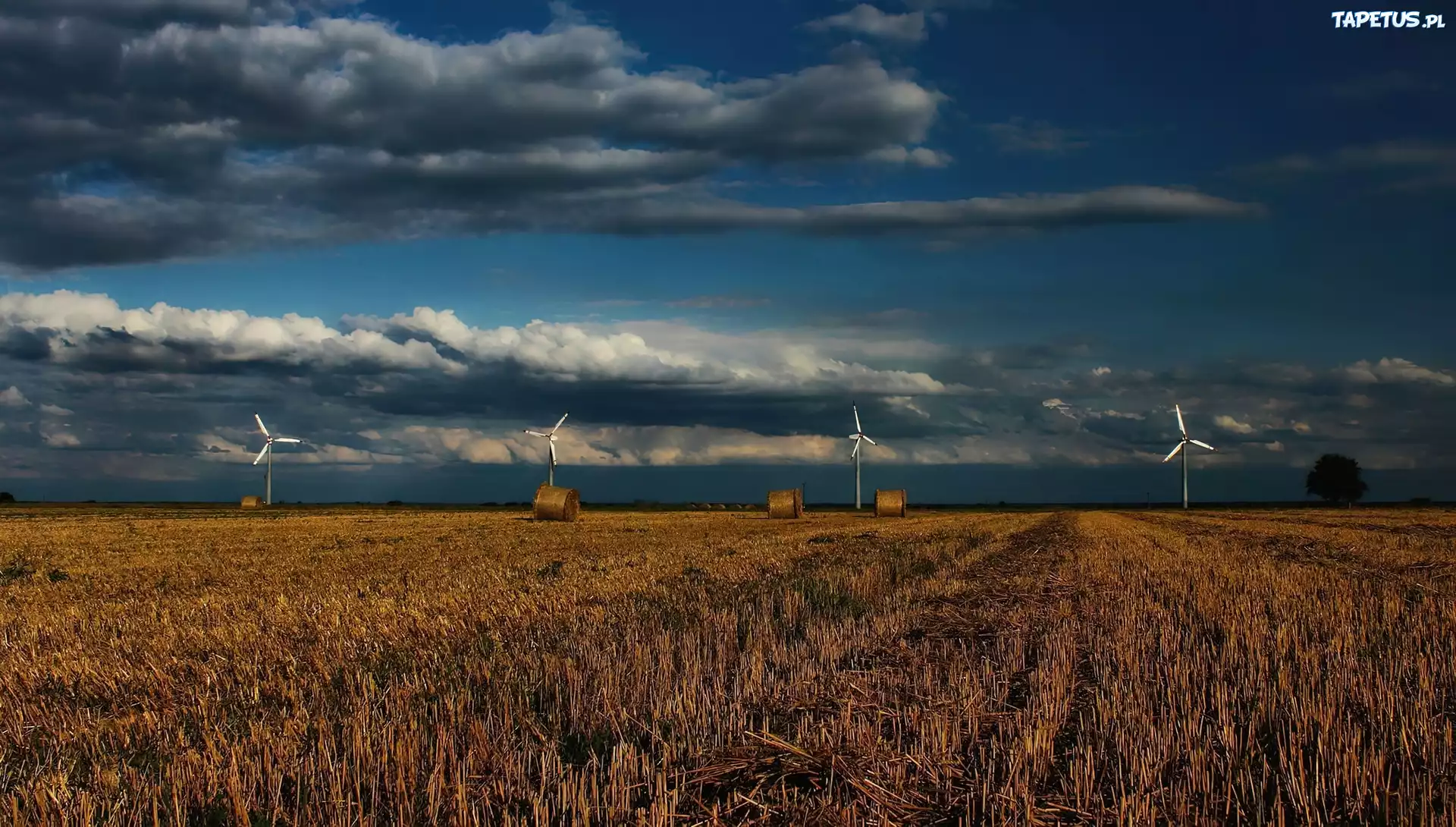 Tapeta Słoma, Ściernisko, Wiatraki, Chmury