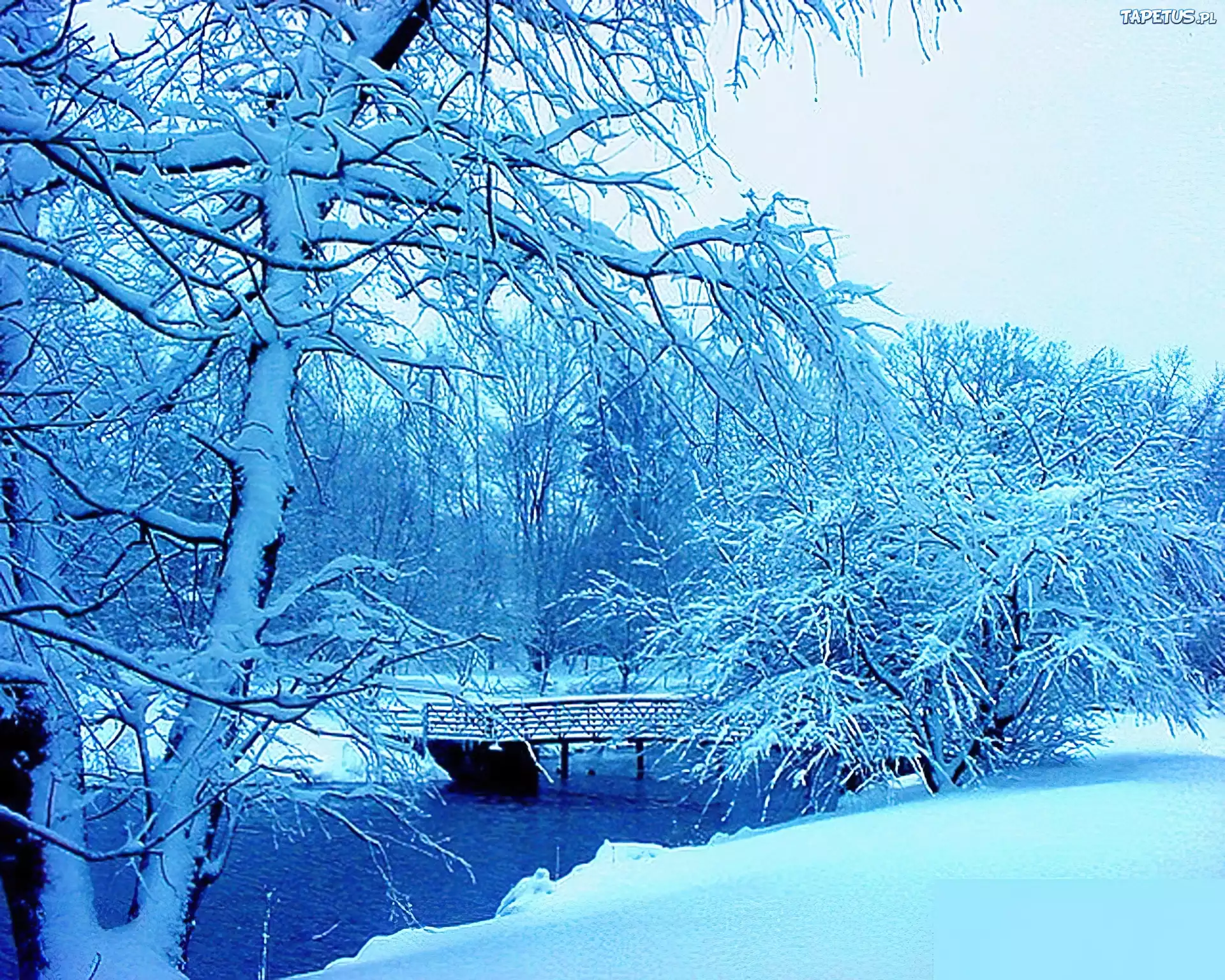 Tapeta Zima, Rzeka, Mostek, Ośnieżone, Drzewa