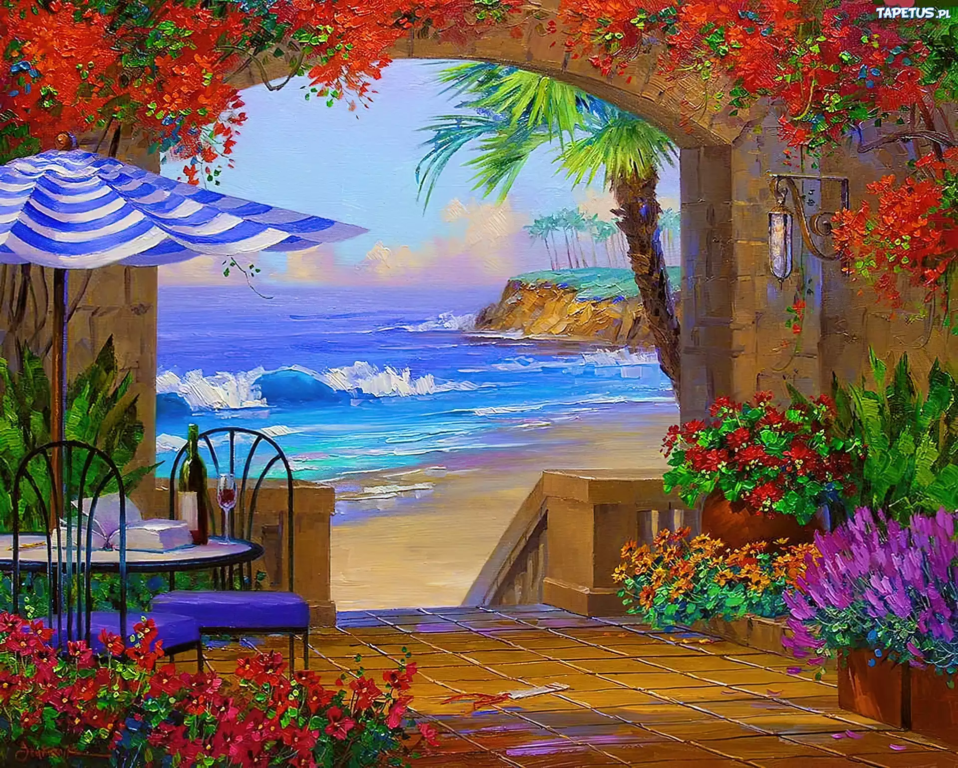 Tapeta Dom, Taras, Kwiaty, Stolik, Parasol