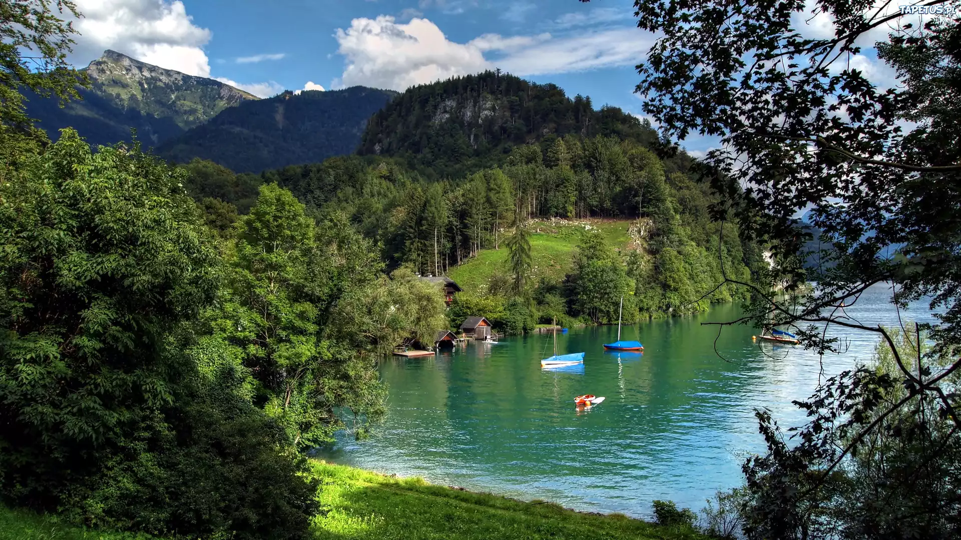 Tapeta Jezioro, Góry, Lasy, Przystań, Łódki