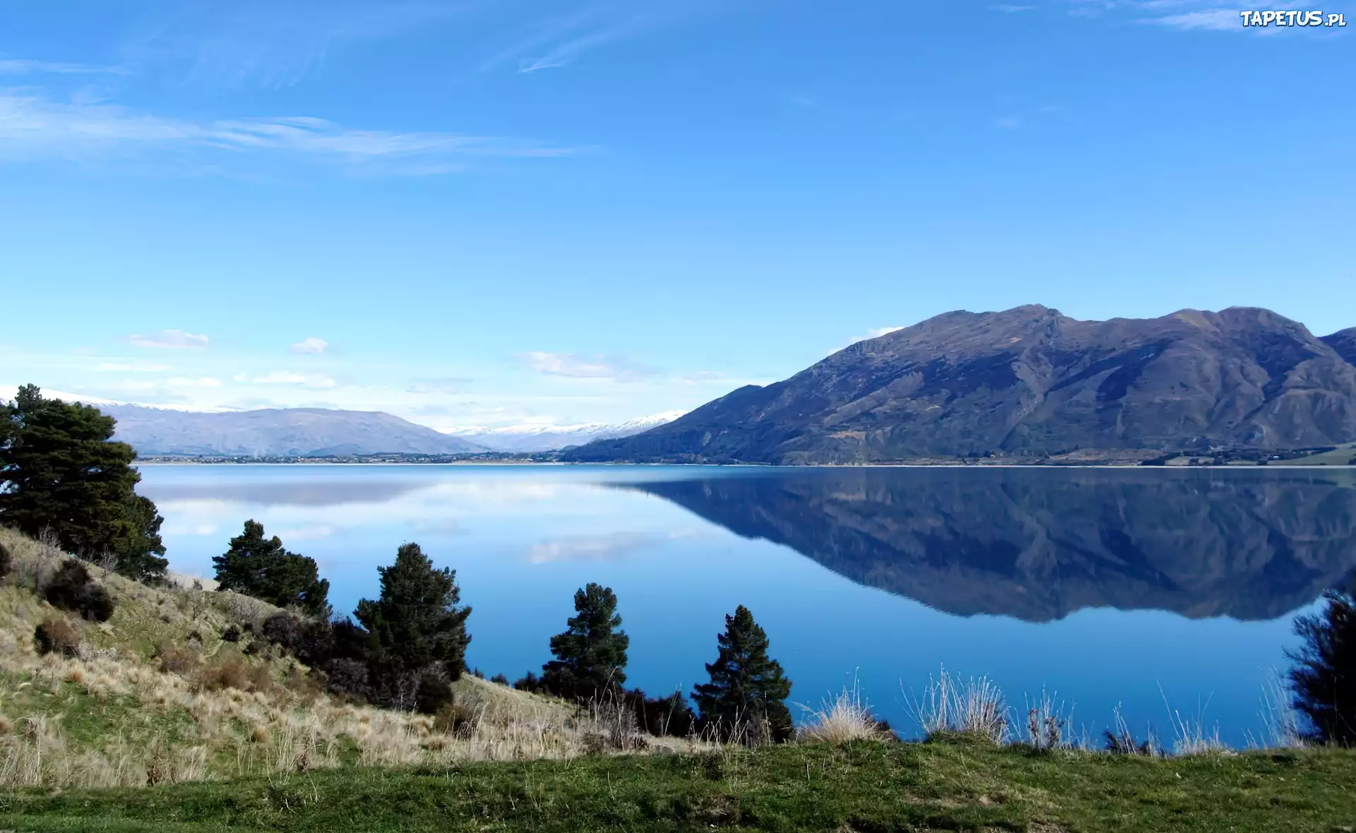 Tapeta Jezioro, Drzewa, Góry, Hawea, Nowa Zelandia
