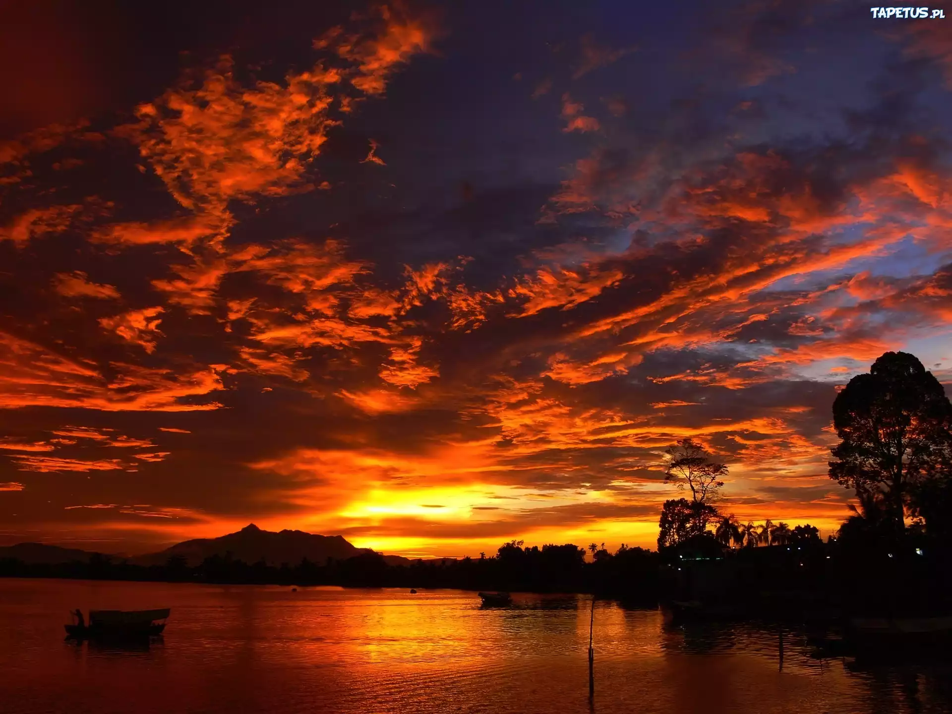 Tapeta Zachód, Słońca, Chmury, Morze, Drzewa, łódź