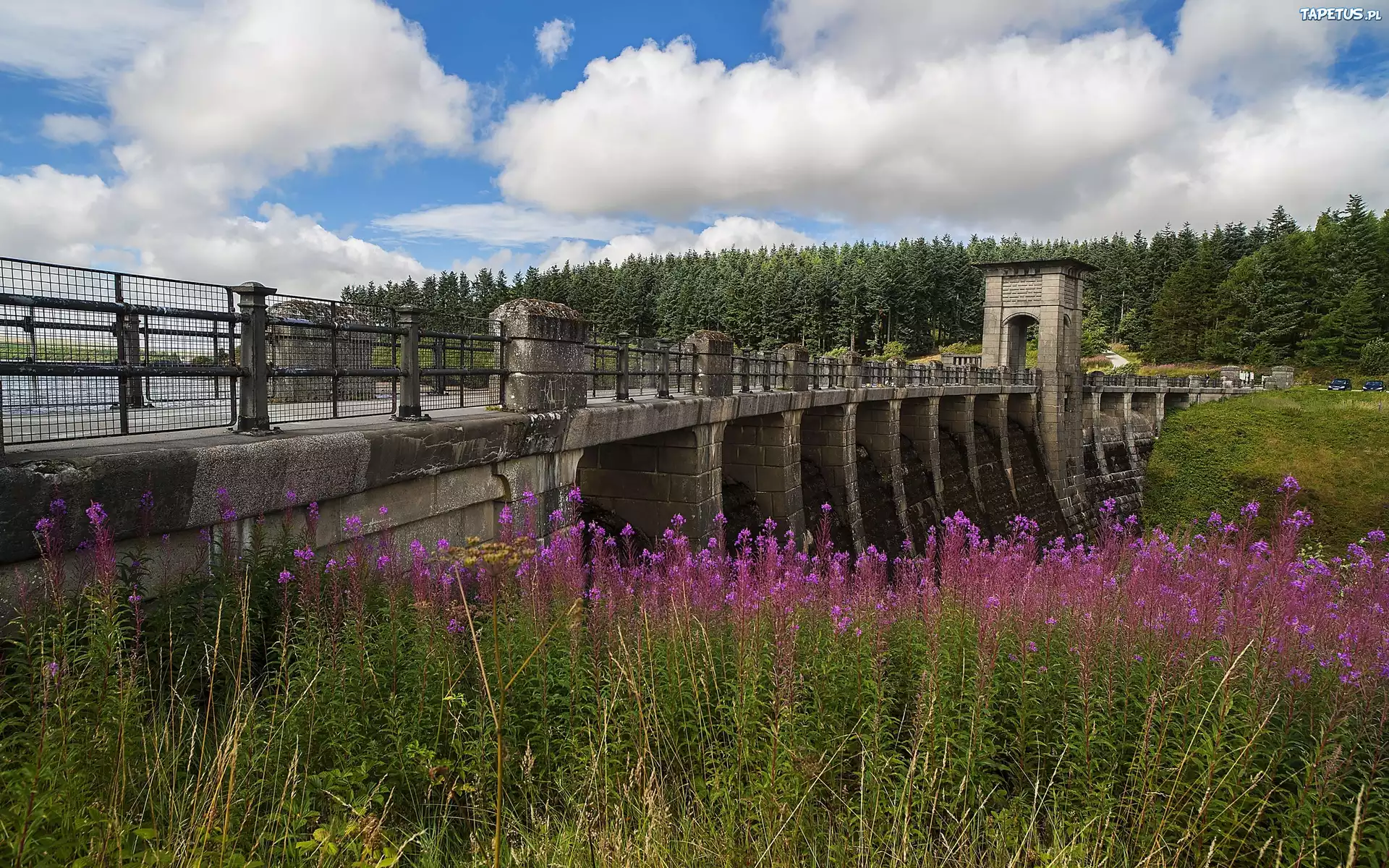 Tapeta Rzeka, Las, Kwiaty, Tama