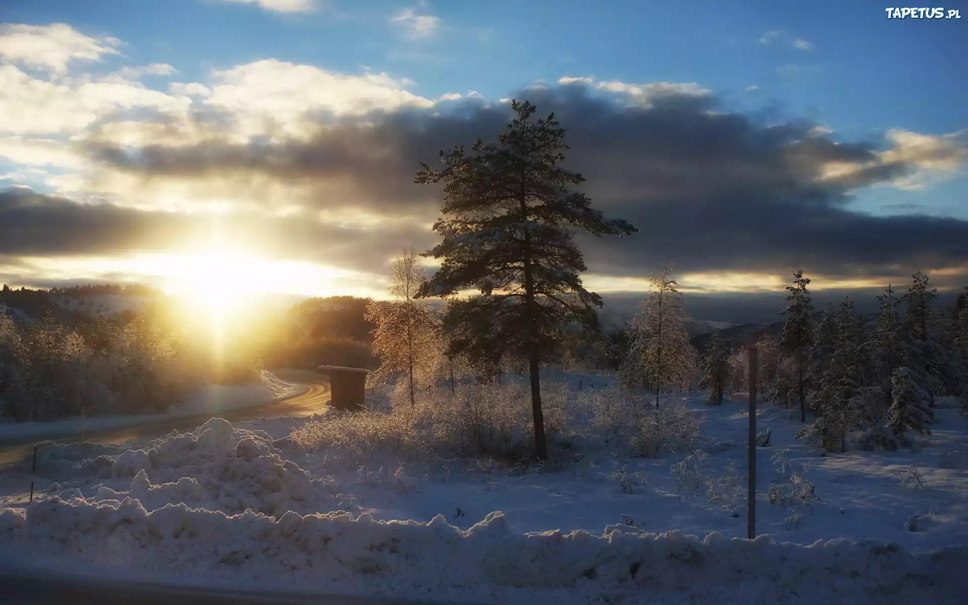 Tapeta Droga, Chmury, Śnieg, Promienie słońca
