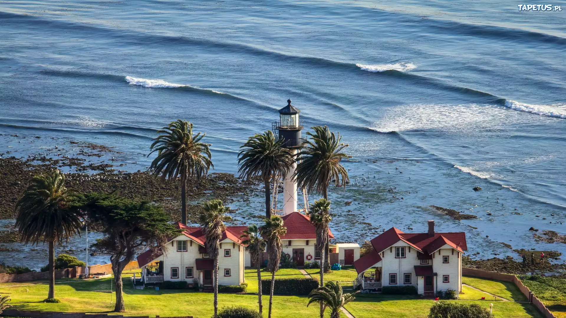 Tapeta Stany Zjednoczone, San Diego, Ocean, Palmy, Latarnia Morska, Domy