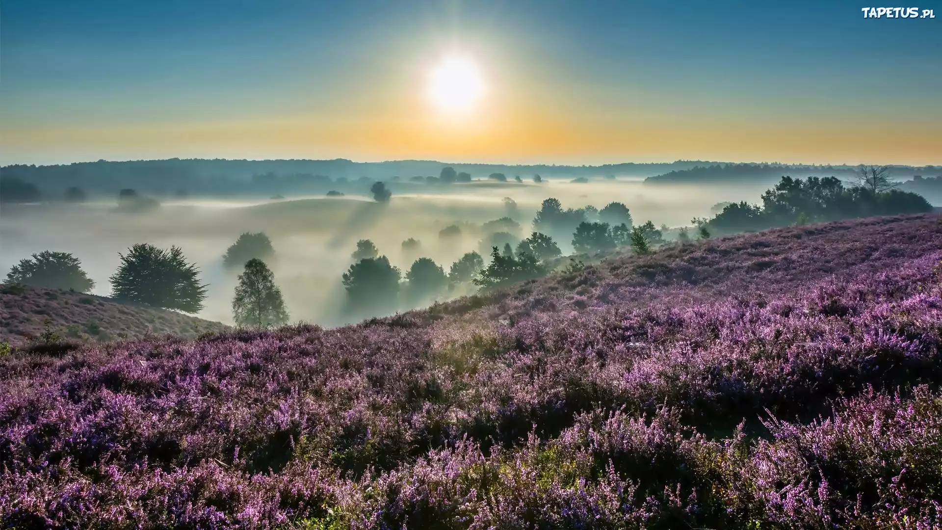 Tapeta Łąki, Wzgórza, Mgła, Wrzosy, Wschód, Słońca, Wrzosowisko