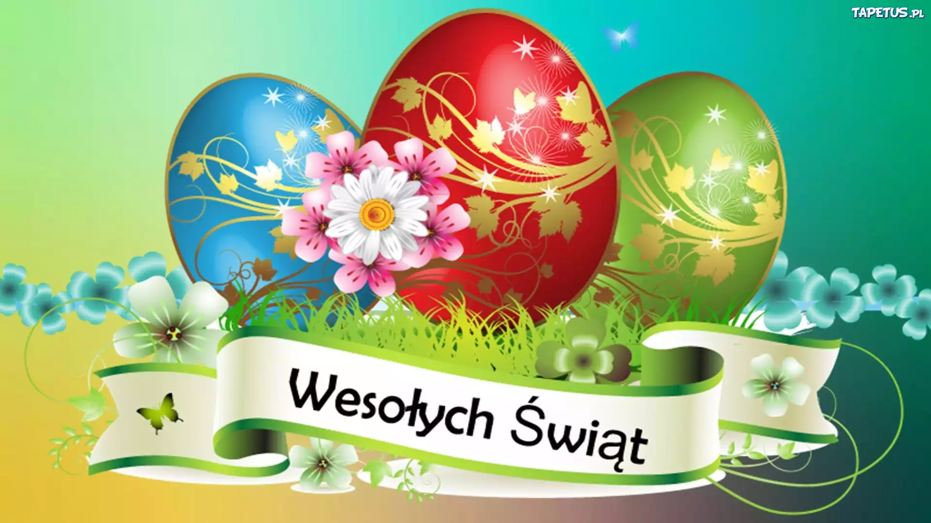 Tapeta Wielkanoc, Pisanki, Kwiaty, Wstążka