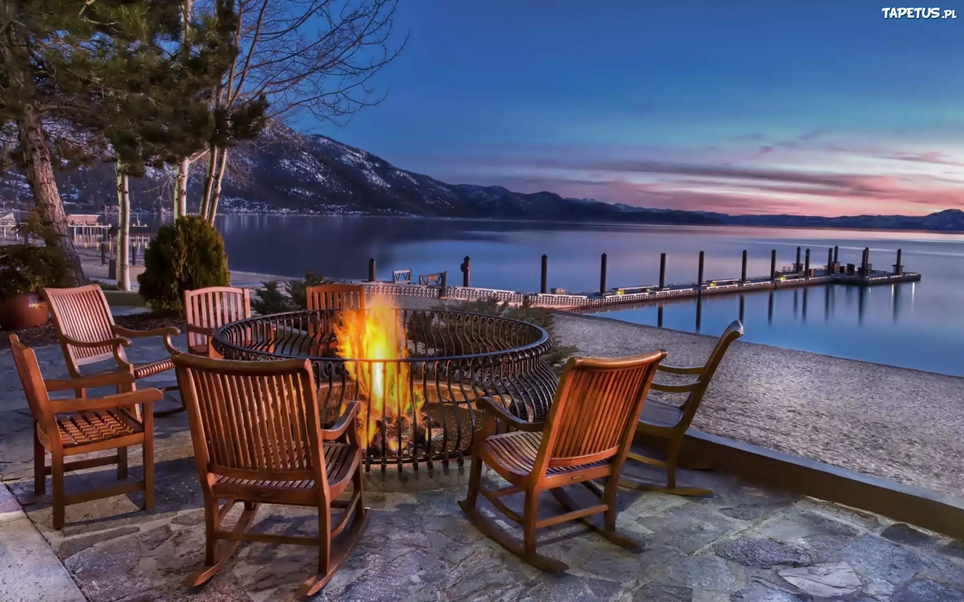 Tapeta Jezioro Tahoe, Molo, Ognisko, Kurort, Góry, Sierra Nevada, Zmierzch, USA