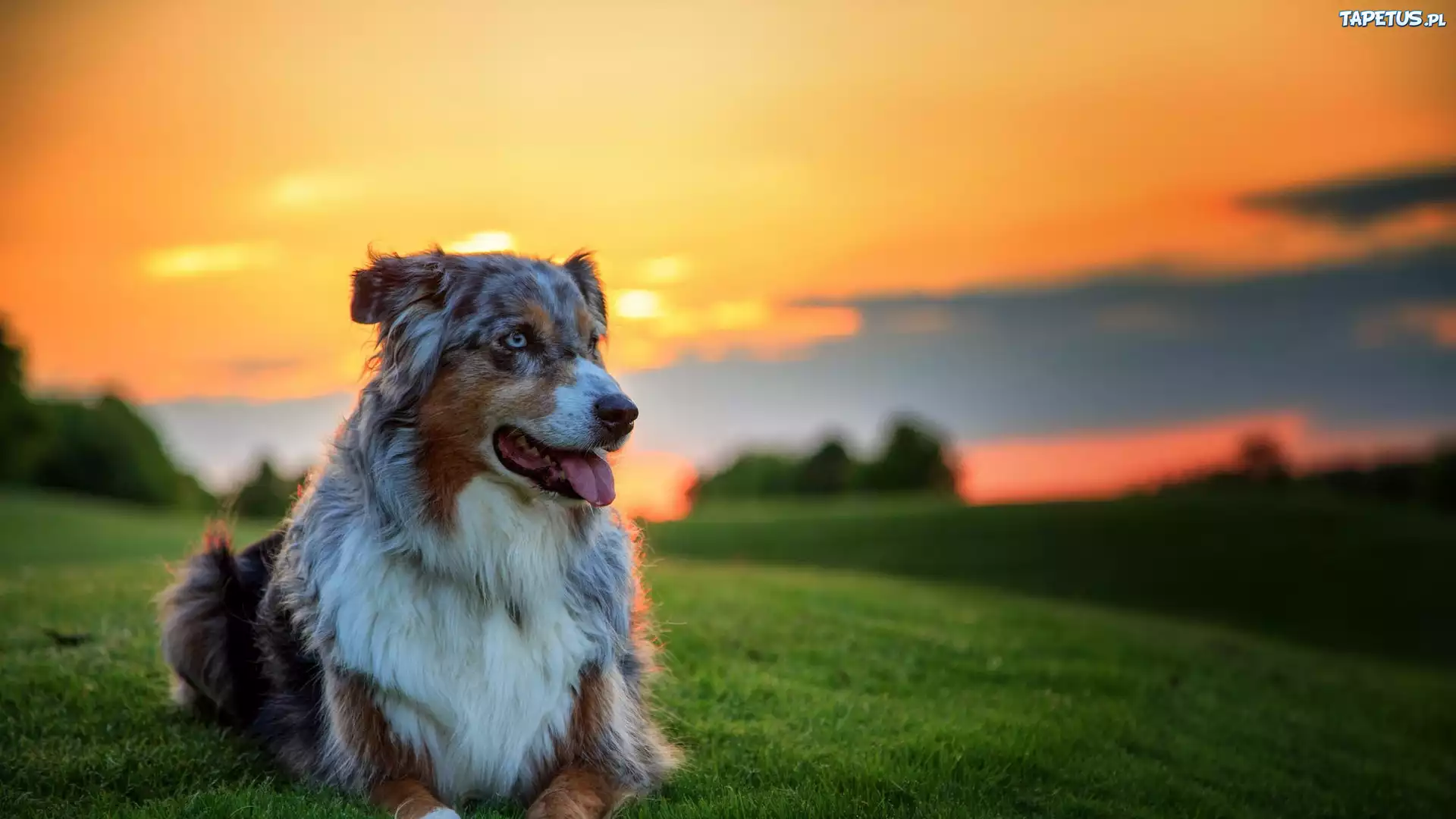 Tapeta Pies, Owczarek Australijski, Zachód, Słońca