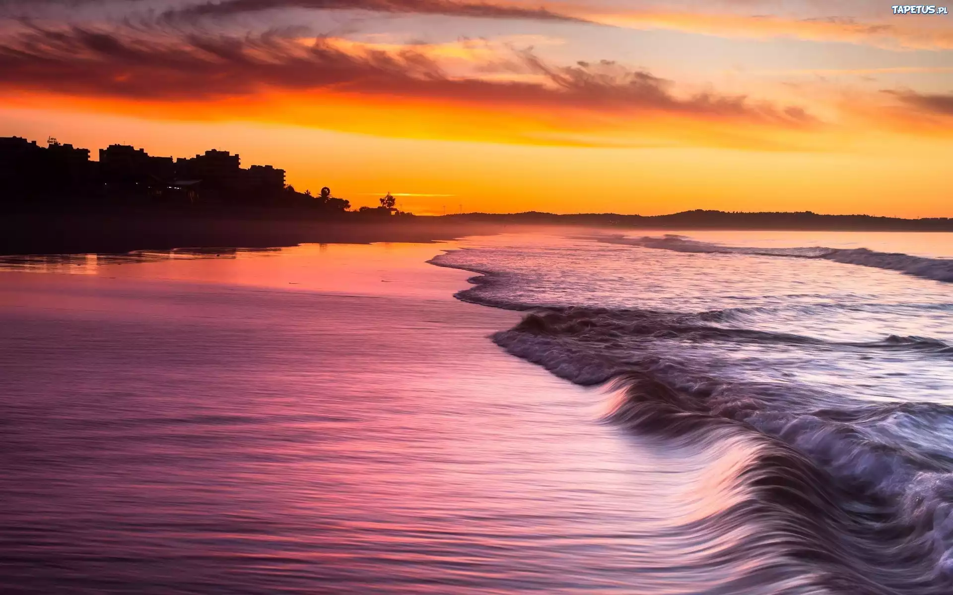 Tapeta Morze, Plaża, Budynki, Zachód Słońca