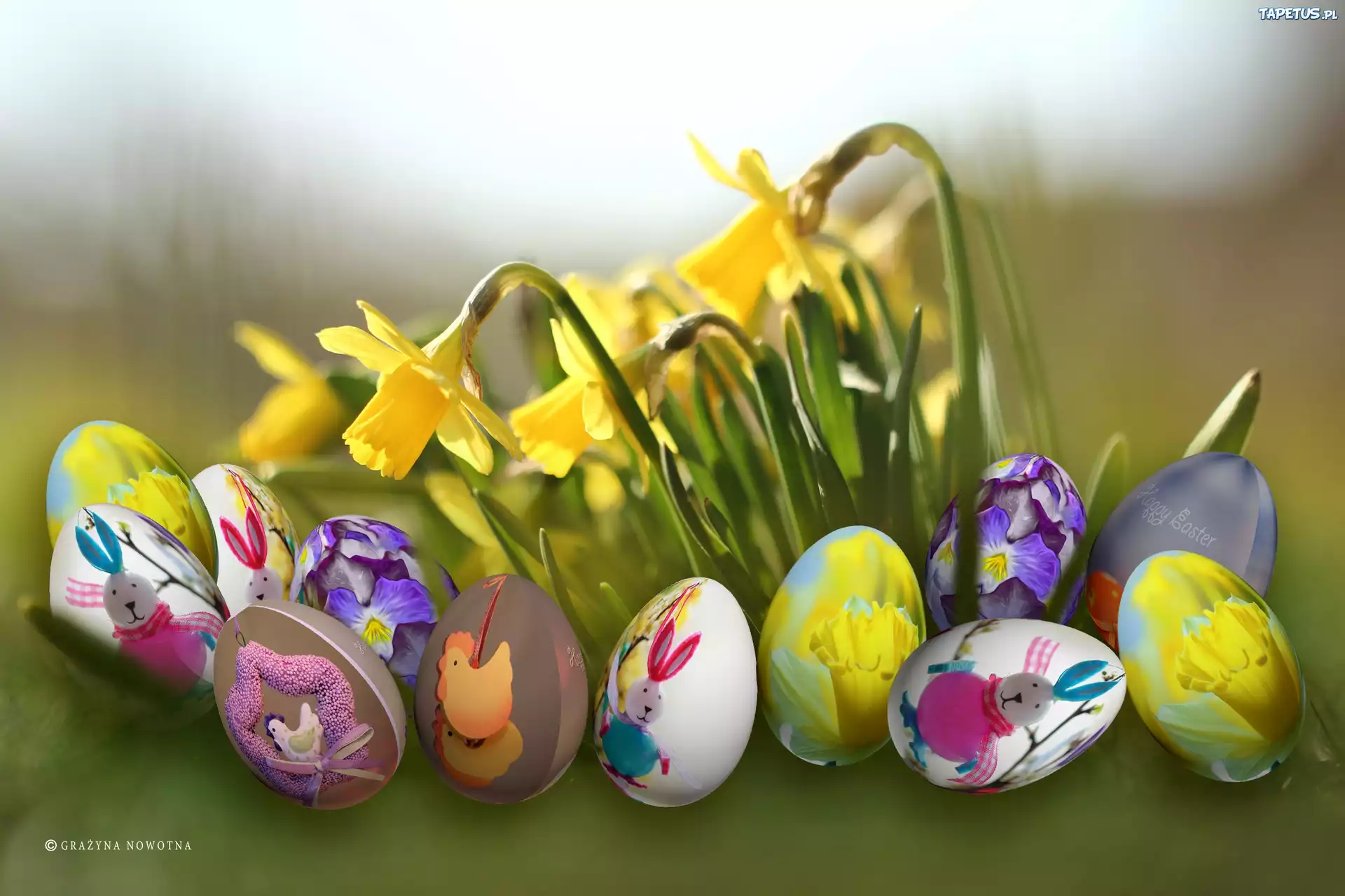 Tapeta Kolorowe, Jajeczka, Żonkile, Kwiaty, Święta, Wielkanoc