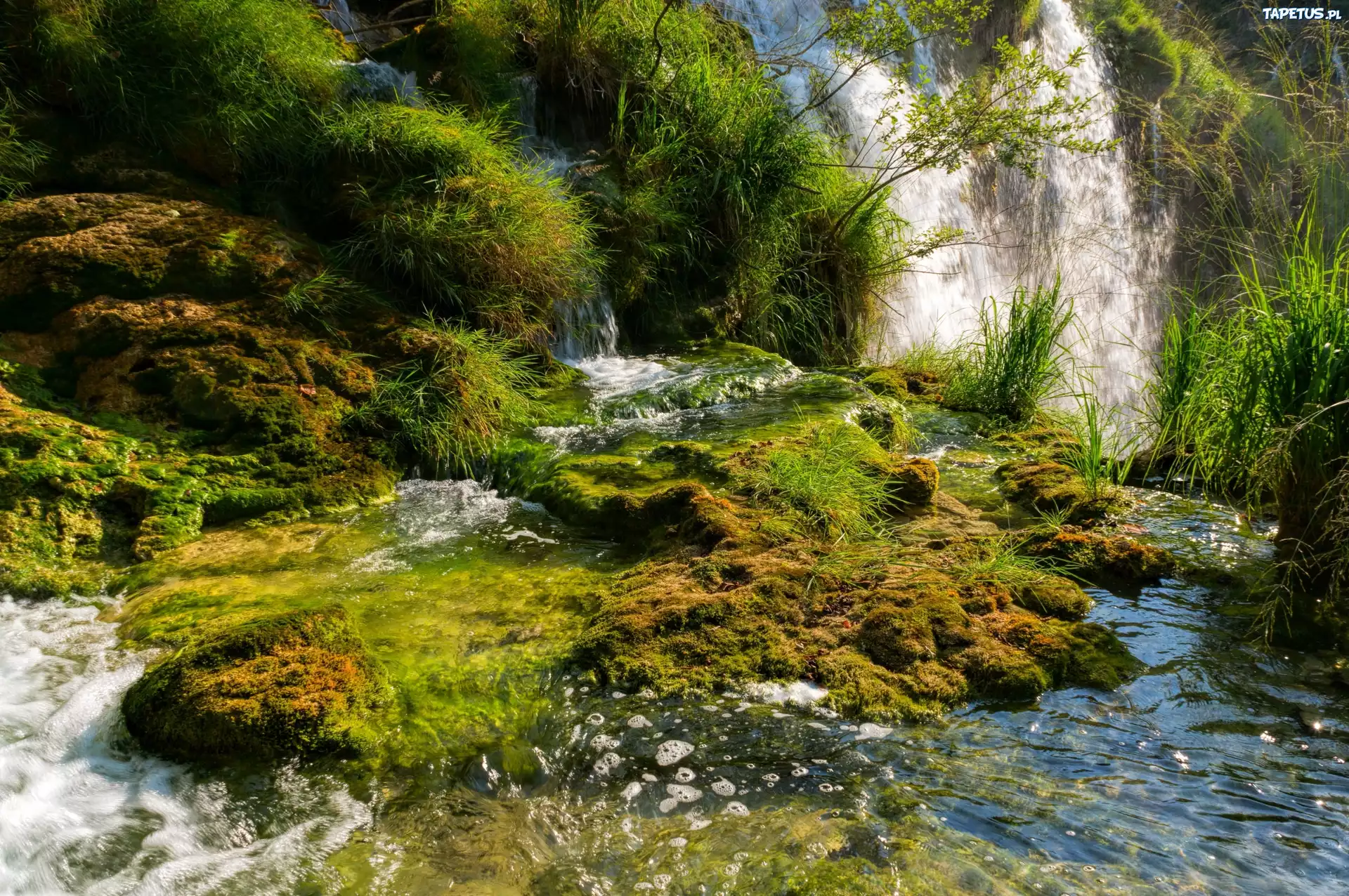 Tapeta Wodospad, Kaskady, Krzewy, Mech