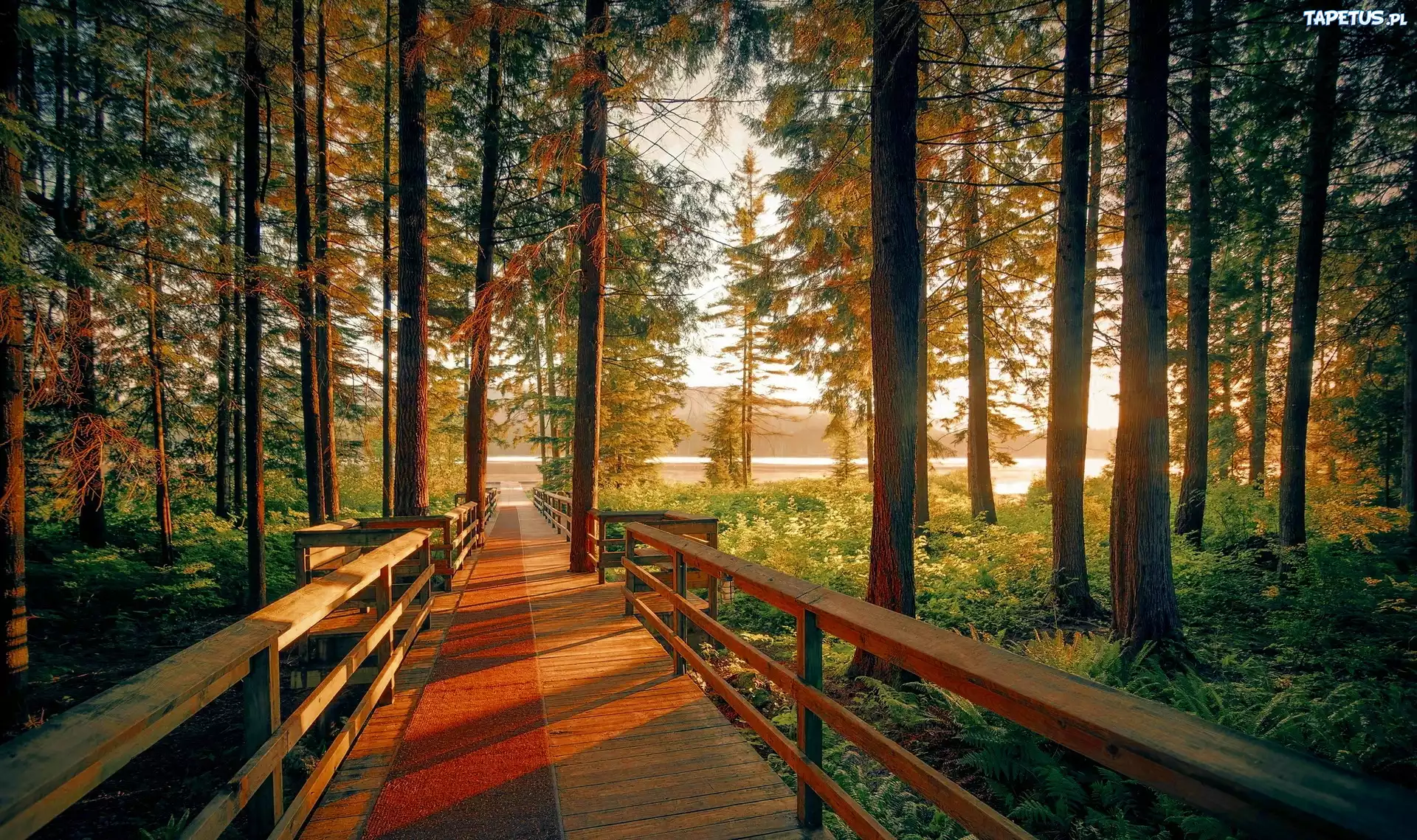 Tapeta Las, Pomost, Jezioro, Zachód Słońca