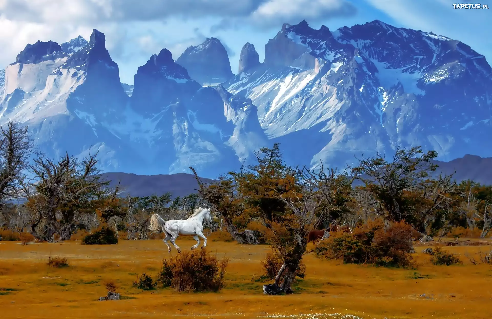 Słowa Kluczowe: Biały , Koń , Góry , Krzewy