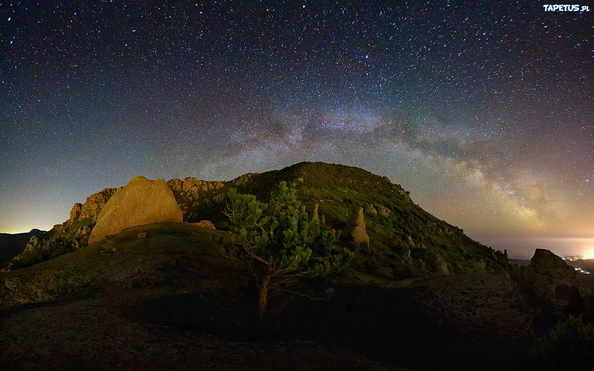 Tapeta Wzgórze, Drzewo, Niebo, Gwiazdy