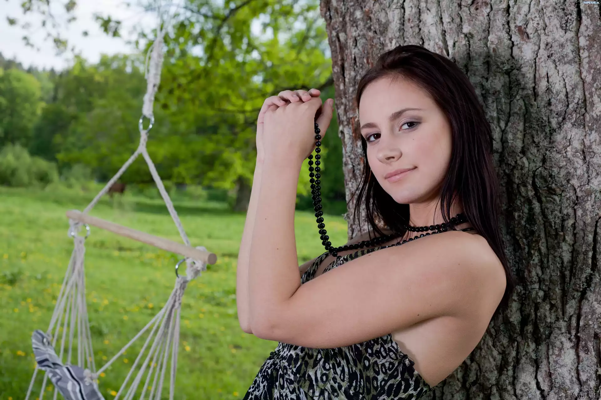 Tapeta Brunetka, Dziewczyna, Korale, Drzewo, Hamak