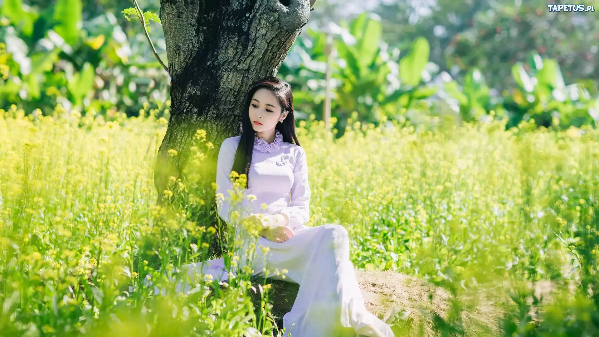 Tapeta Wiosna, Łąka, Kwiaty, Kobieta, Drzewo