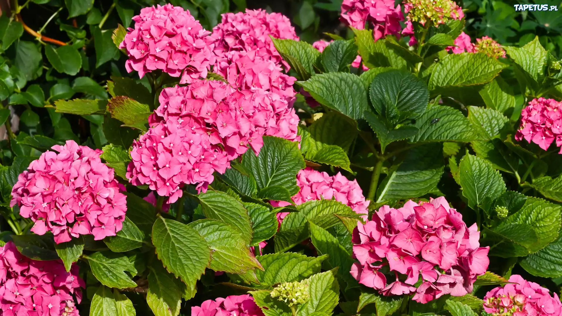 Tapeta Kwiaty, Różowe, Hortensje, Liście, Krzew