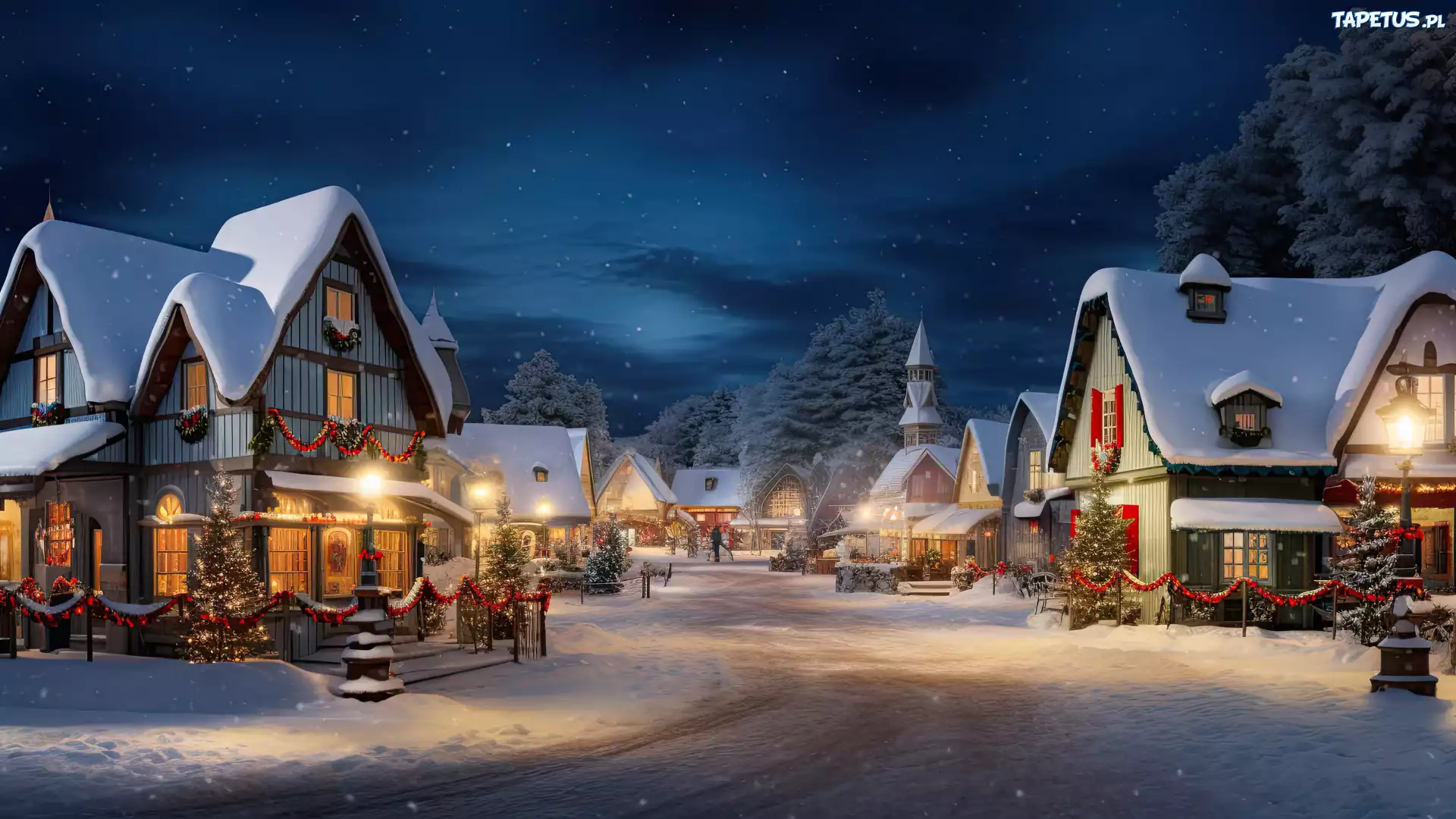 Tapeta Zima, Dekoracje, Domy, Śnieg, Drzewa, Światła, Ulica, Noc, 2D