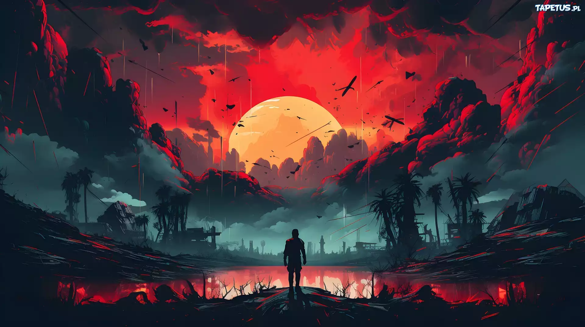 Tapeta Grafika, Zachód słońca, Góry, Jezioro, Drzewa, Mężczyzna