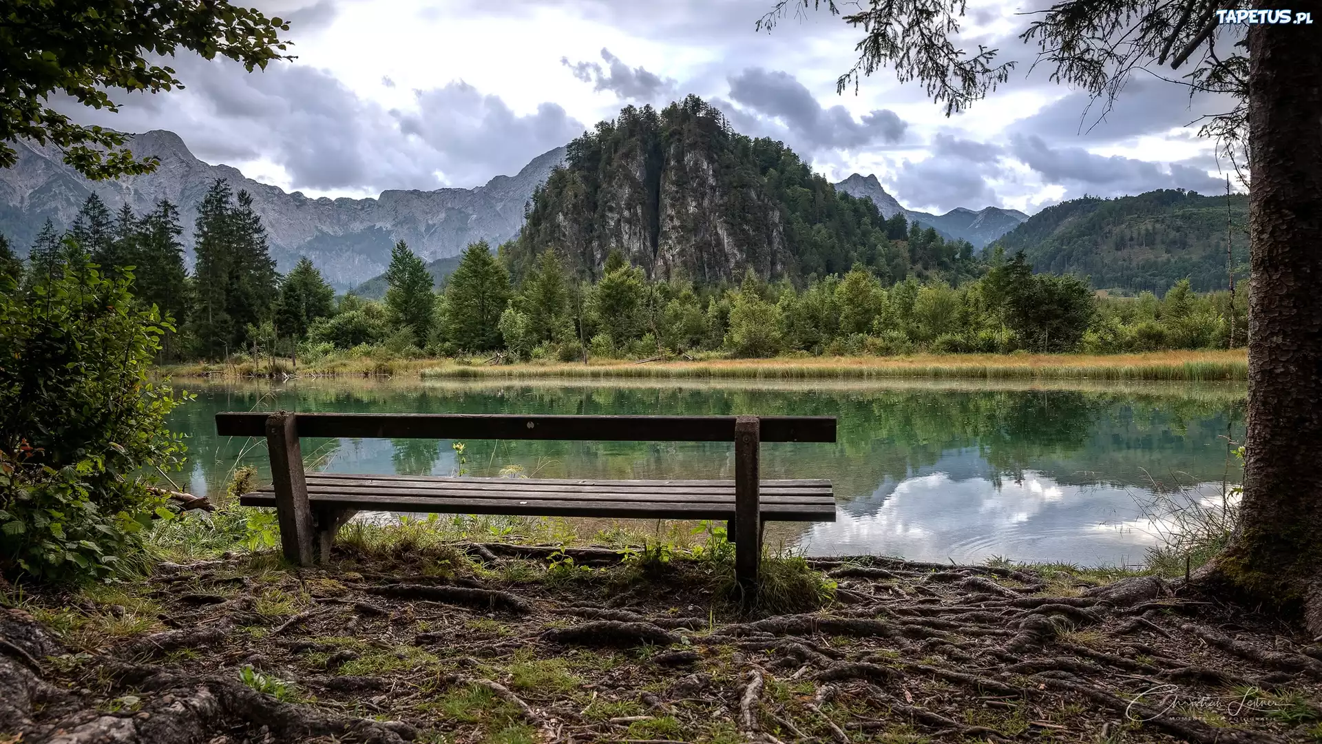 Tapeta Austria, Góry, Jezioro, Almsee, Ławka, Drzewa