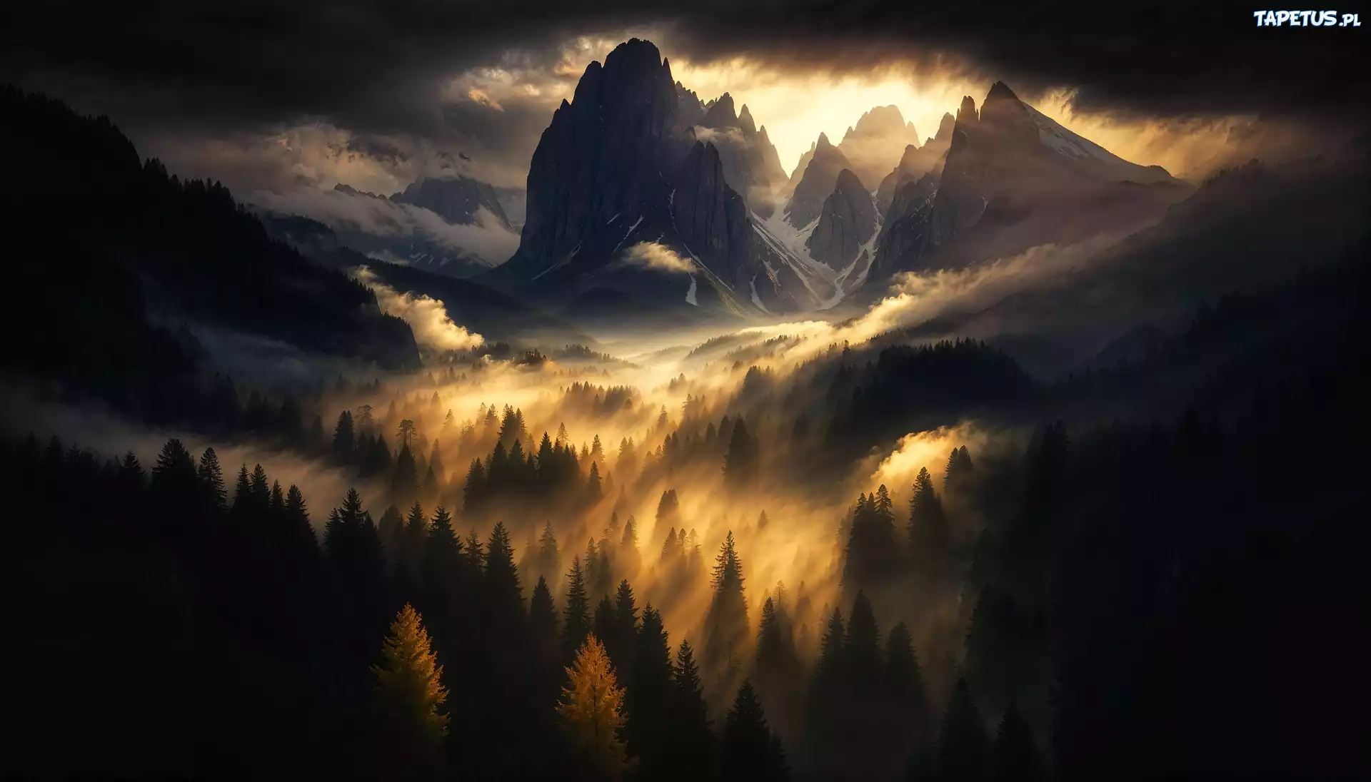 Tapeta Góry, Szczyty, Drzewa, Mgła, Zachód słońca