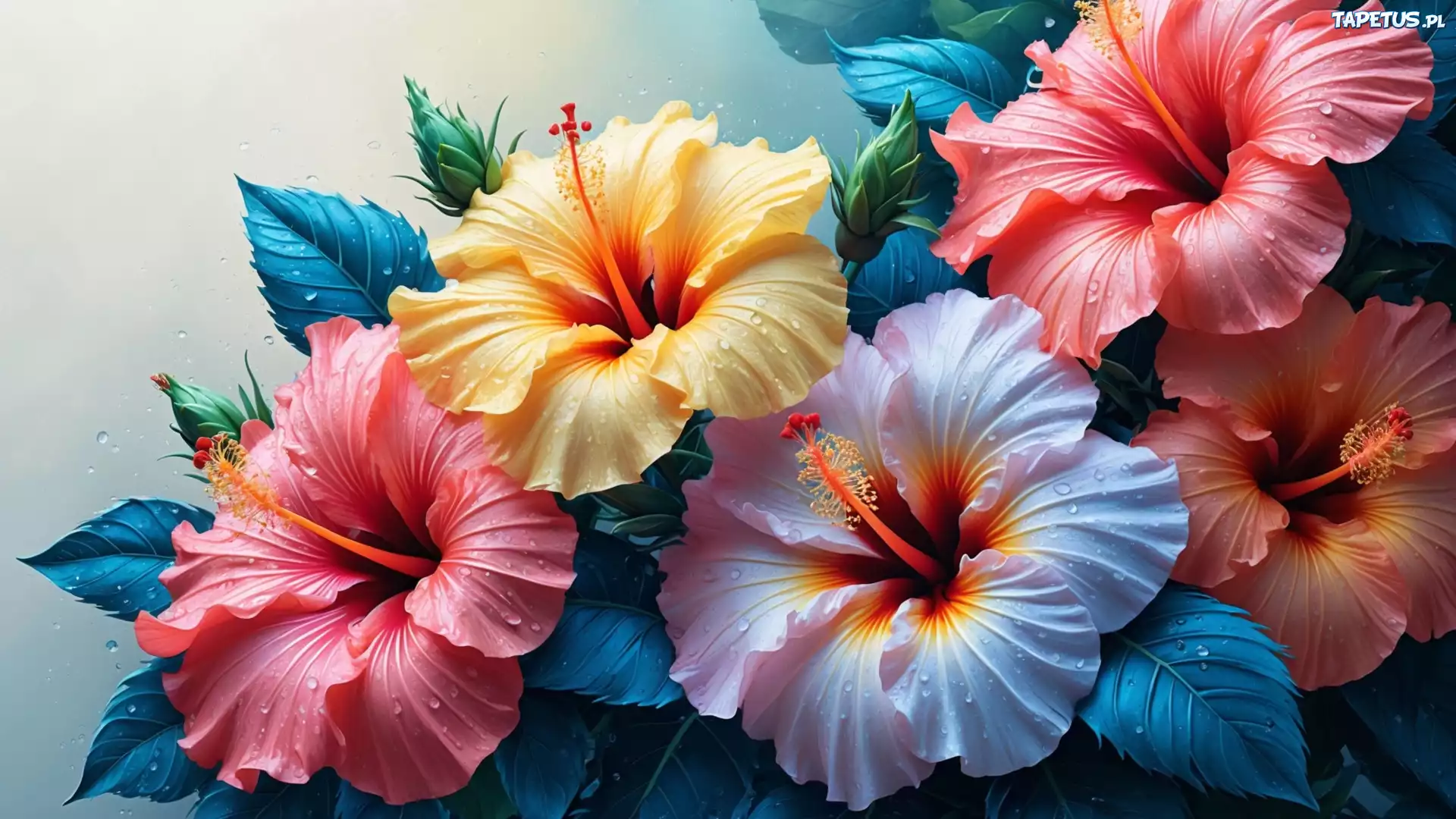 Tapeta Kwiaty, Kolorowe, Hibiskusy, Krople, Zbliżenie
