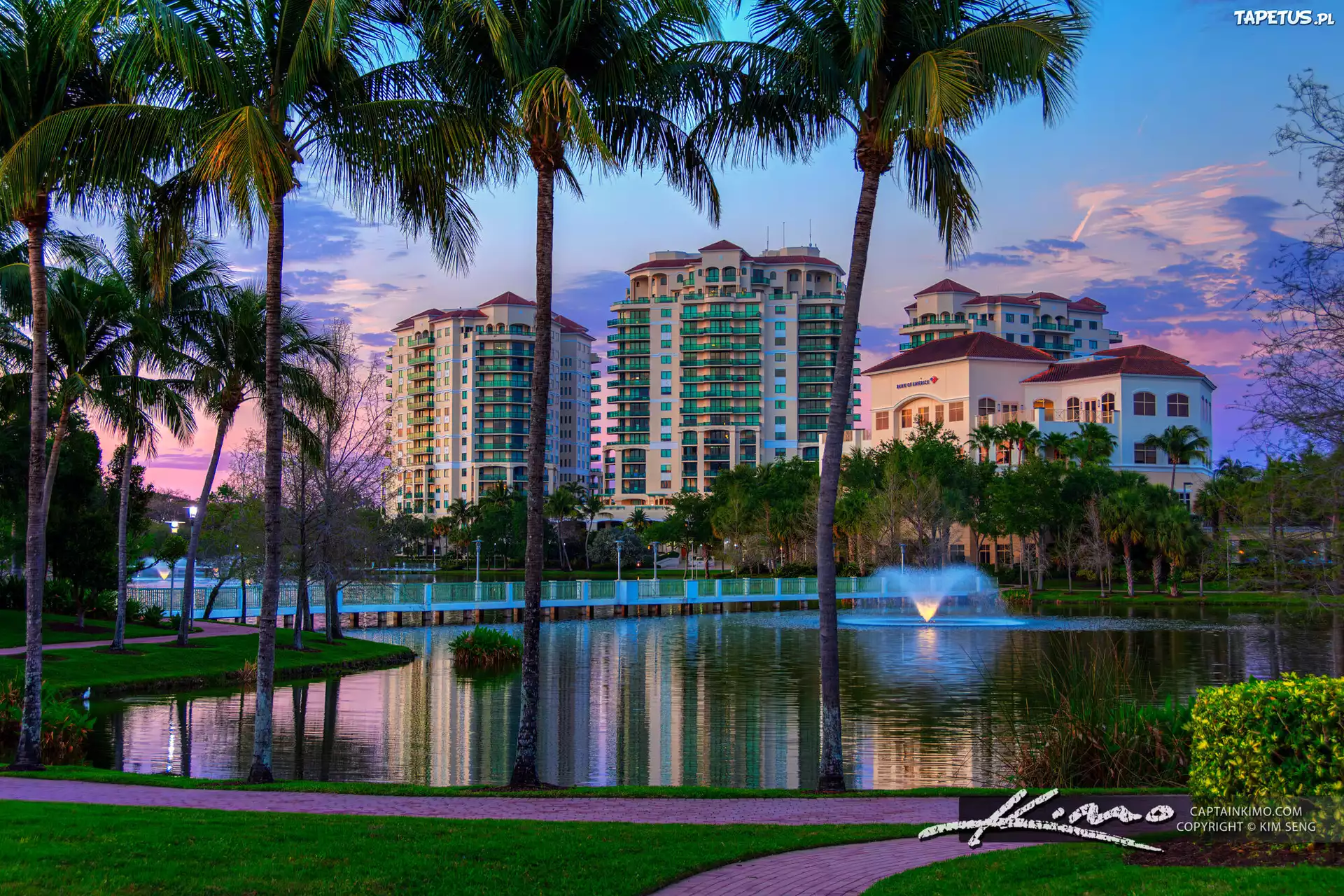 Tapeta Stany Zjednoczone, Floryda, Palm Beach Gardens, Wieżowce, Palmy, Staw, Fontanna, Park