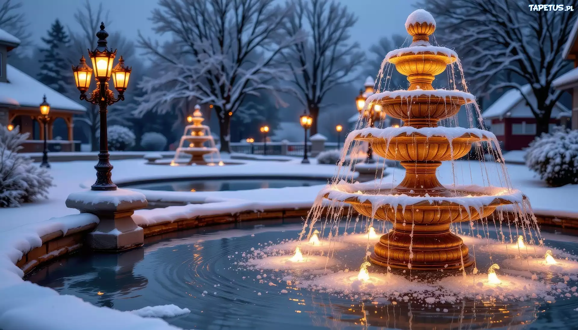 Tapeta Fontanna, Zima, Latarnie, Grafika AI