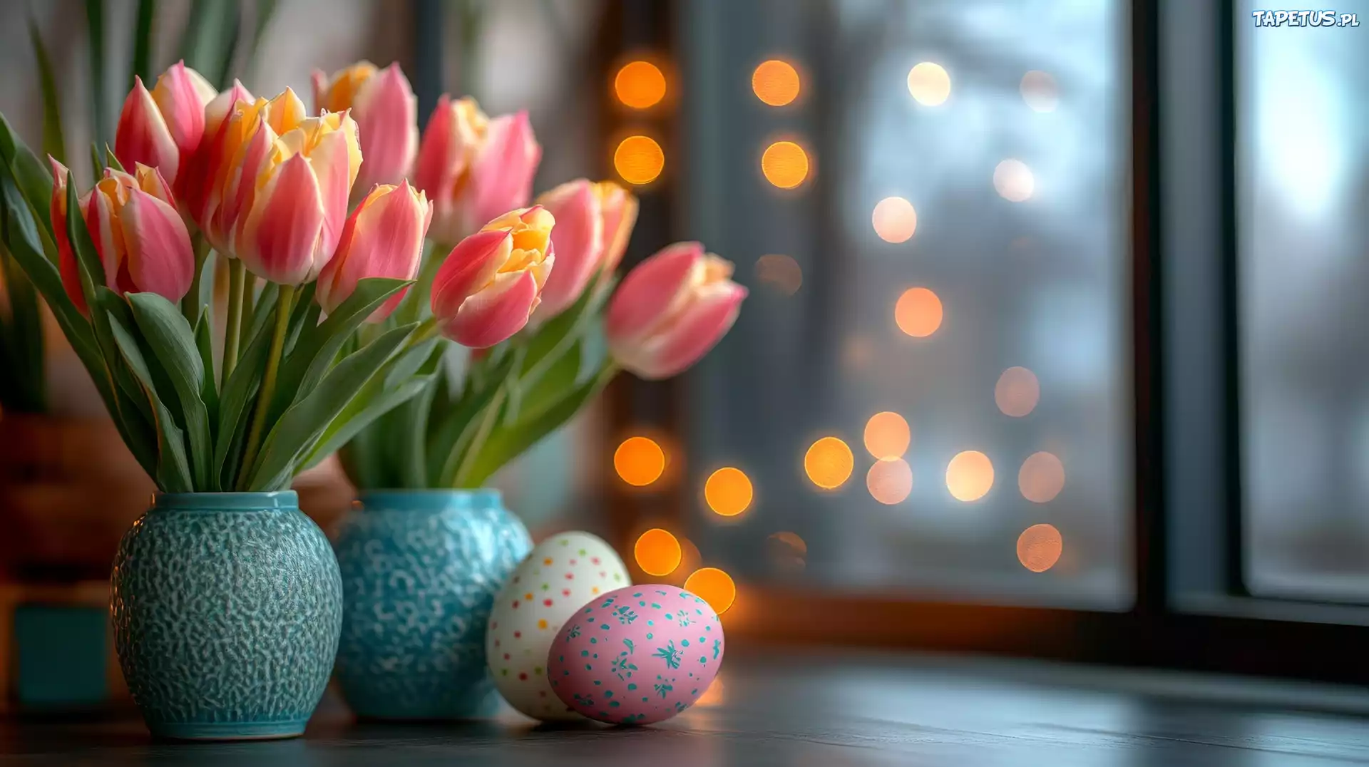 Tapeta Kwiaty, Tulipany, Niebieskie, Wazony, Kolorowe, Pisanki, Okno