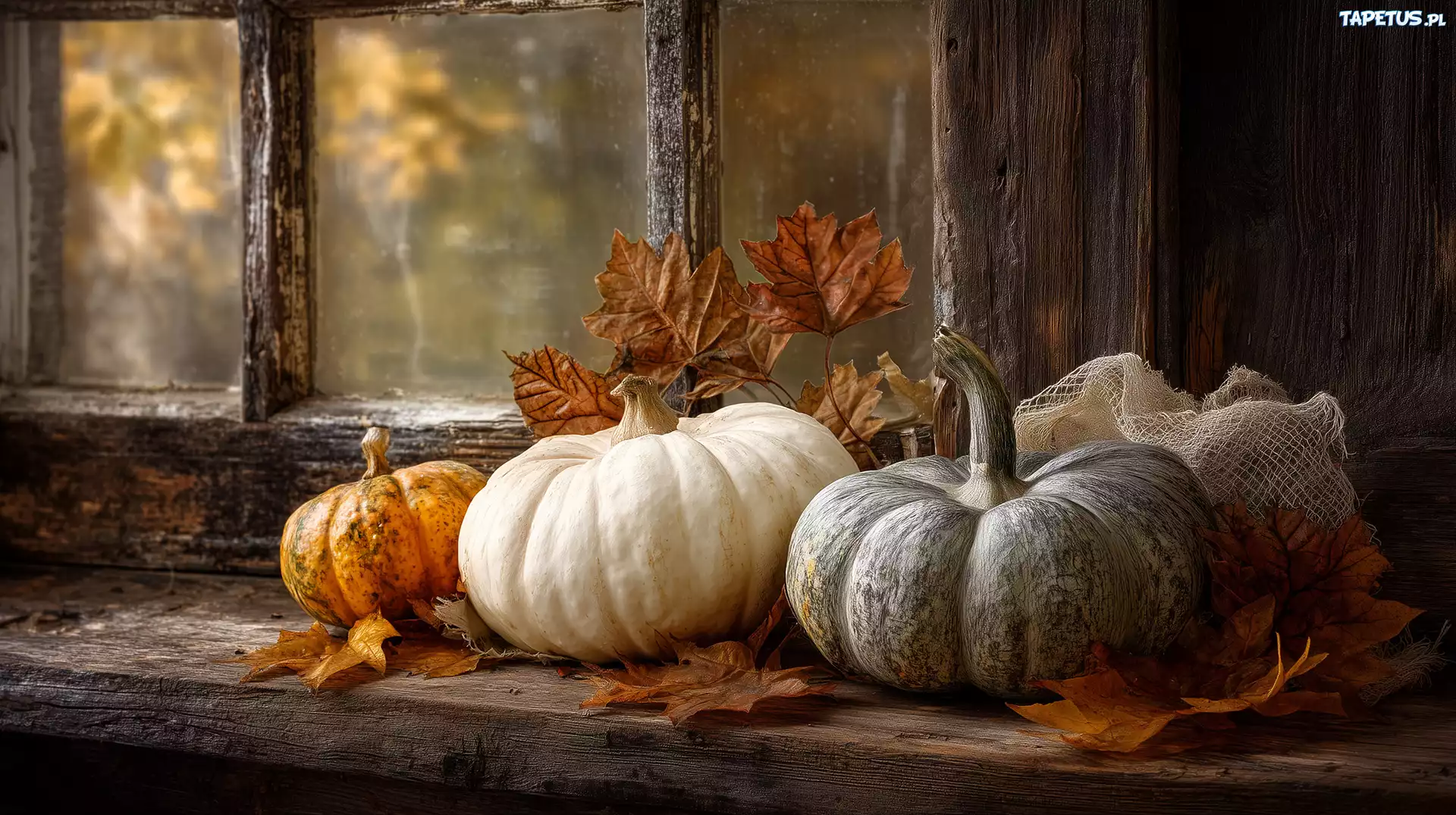 Tapeta Dynie, Okno, Suche, Liście, Grafika AI