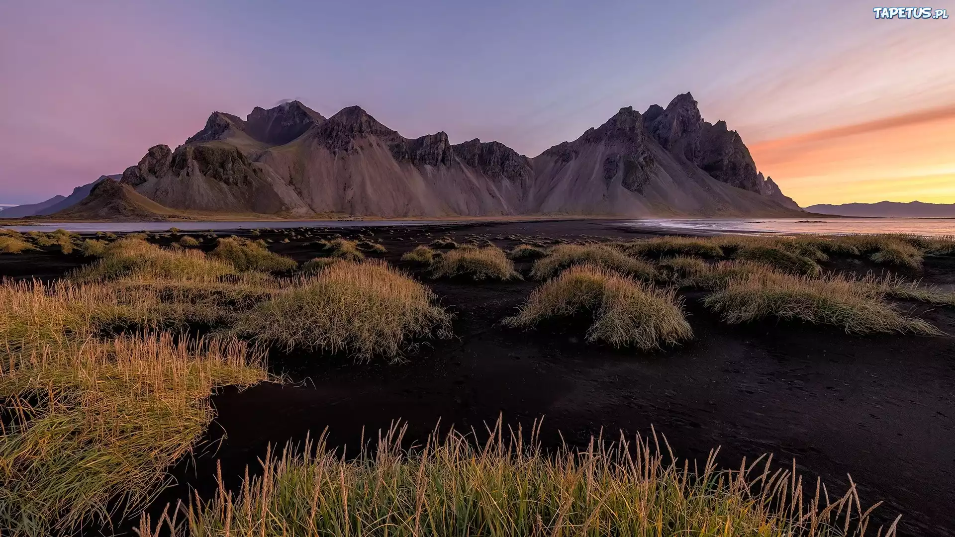 Tapeta Islandia, Góry, Góra Vestrahorn, Plaża, Czarny, Piasek, Trawa, Kępki