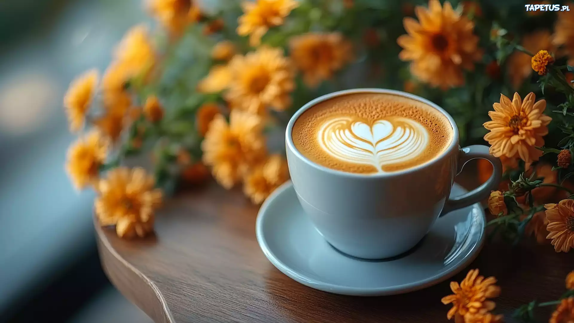 Tapeta Filiżanka, Kawa, Cappuccino, Talerzyk, Stół, Kwiaty, Pomarańczowe