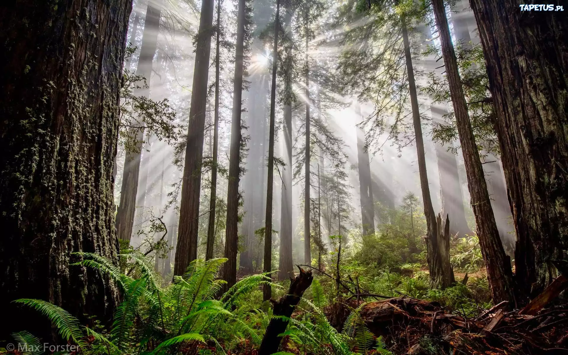 Tapeta Las, Drzewa, Paprocie, Przebijające światło, Mgła