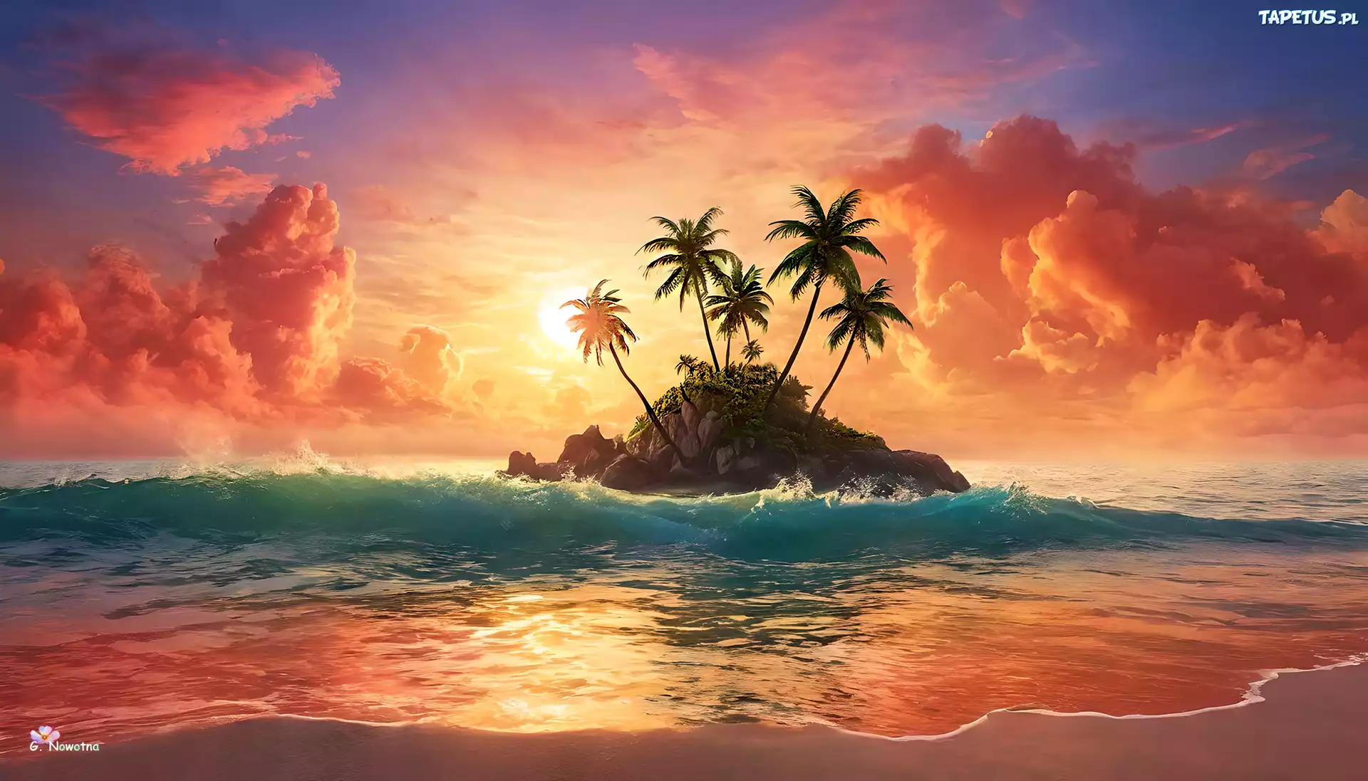 Słowa Kluczowe: Mała , Wyspa , Palmy , Morze , Fala , Chmury , Zachód słońca , Grafika