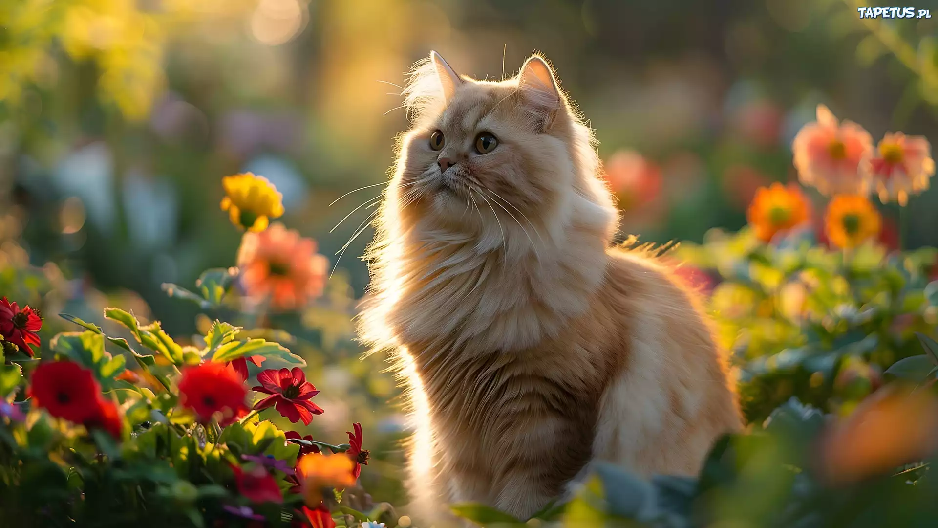 Tapeta Kot, Rudy, Kwiaty, Zachód słońca, Grafika