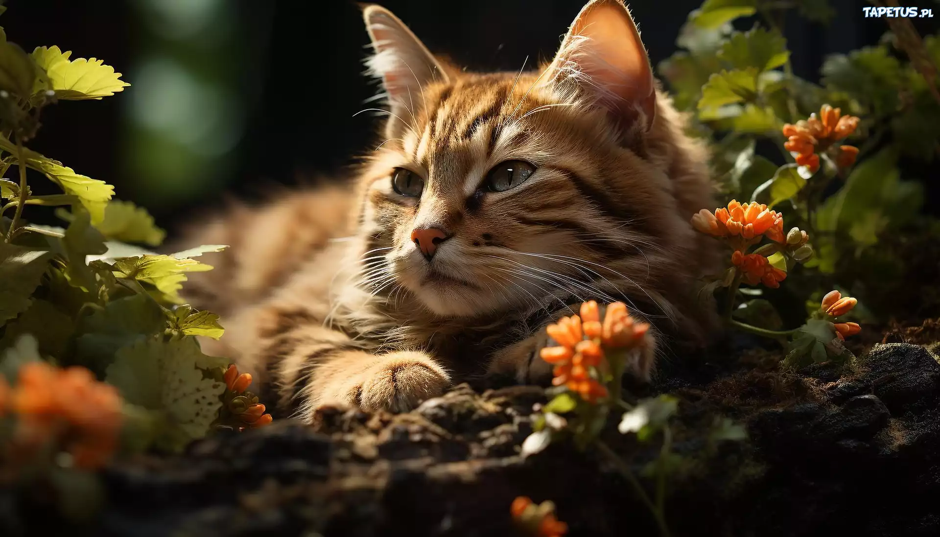 Tapeta Kot, Spojrzenie, Kwiaty, Rośliny