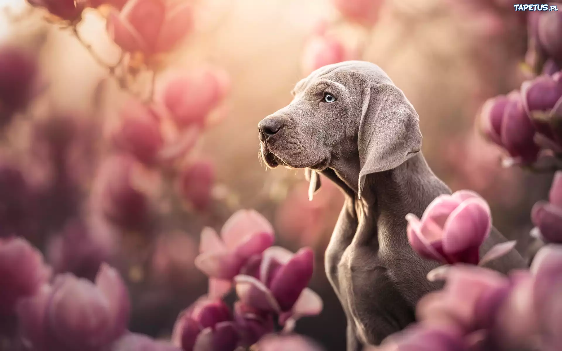 Tapeta Pies, Wyżeł weimarski, Kwiaty, Magnolie, Rozmycie