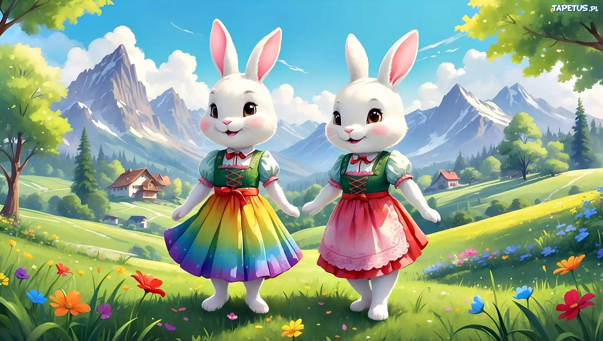 Tapeta Dwa, Króliki, Spódnice, Łąka, Góry