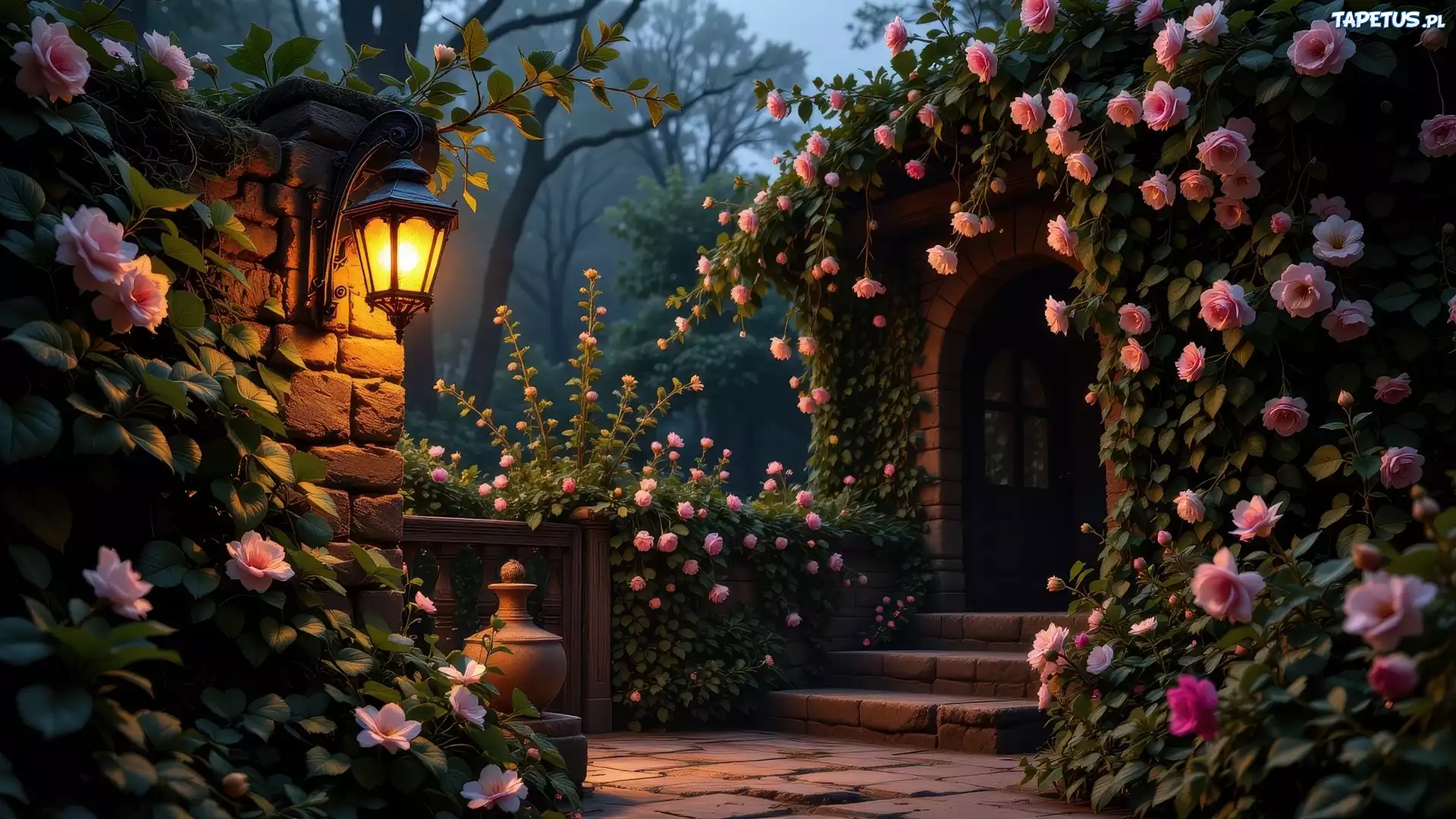 Tapeta Ogród, Świecący, Lampa, Mur, Różowe, Kwiaty, Schody, Drzwi