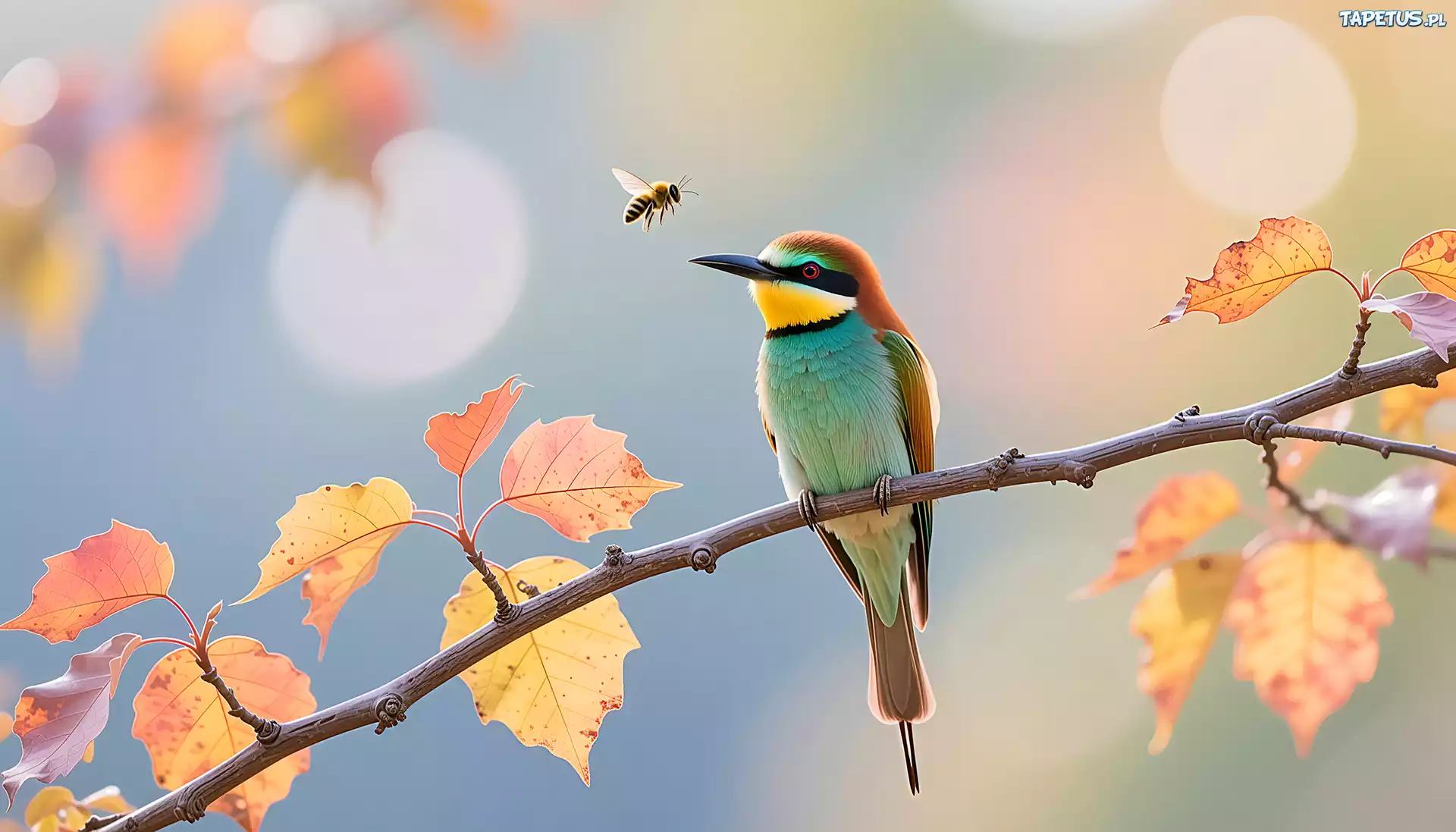 Tapeta Żołna, Ptak, Pszczoła, Gałązka, Jesienne, Liście, Grafika AI