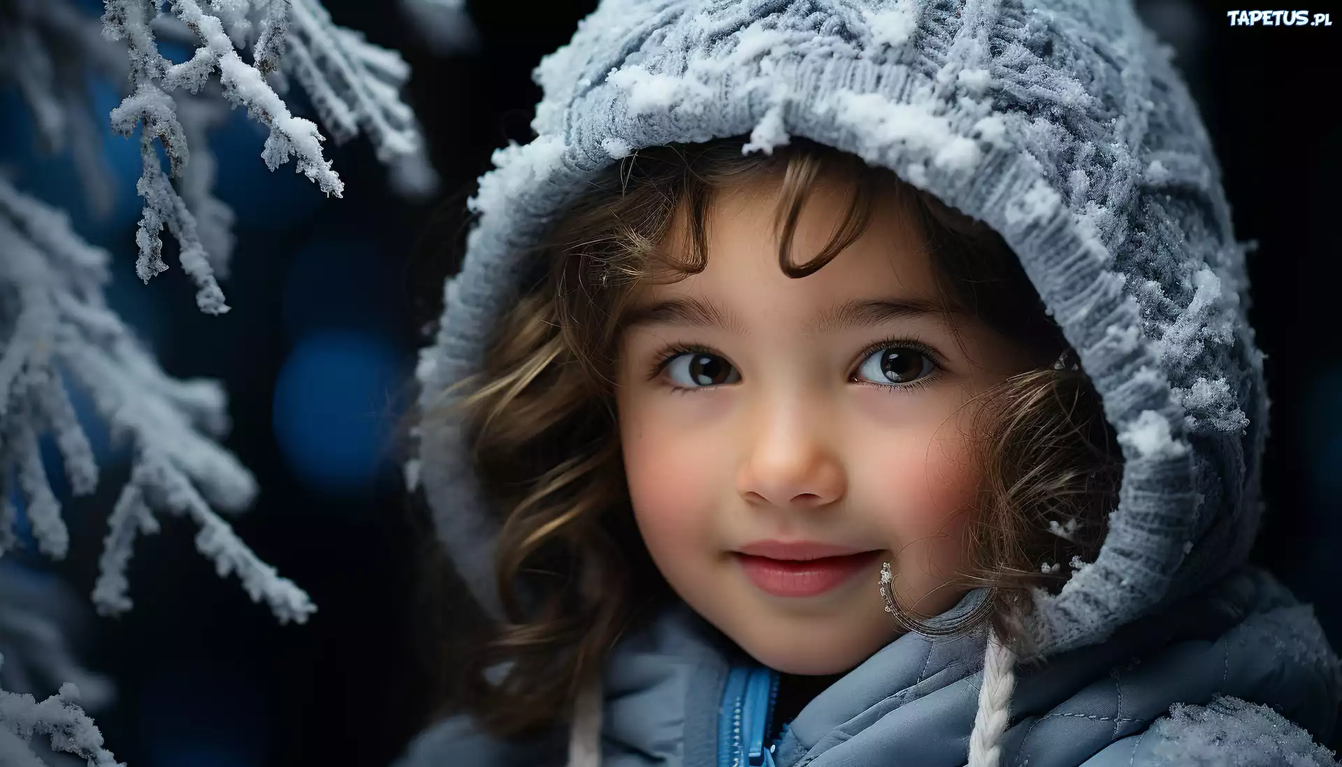 Tapeta Dziecko, Dziewczynka, Kręcone, Włosy, Ośnieżona, Czapka, Gałązki, Grafika