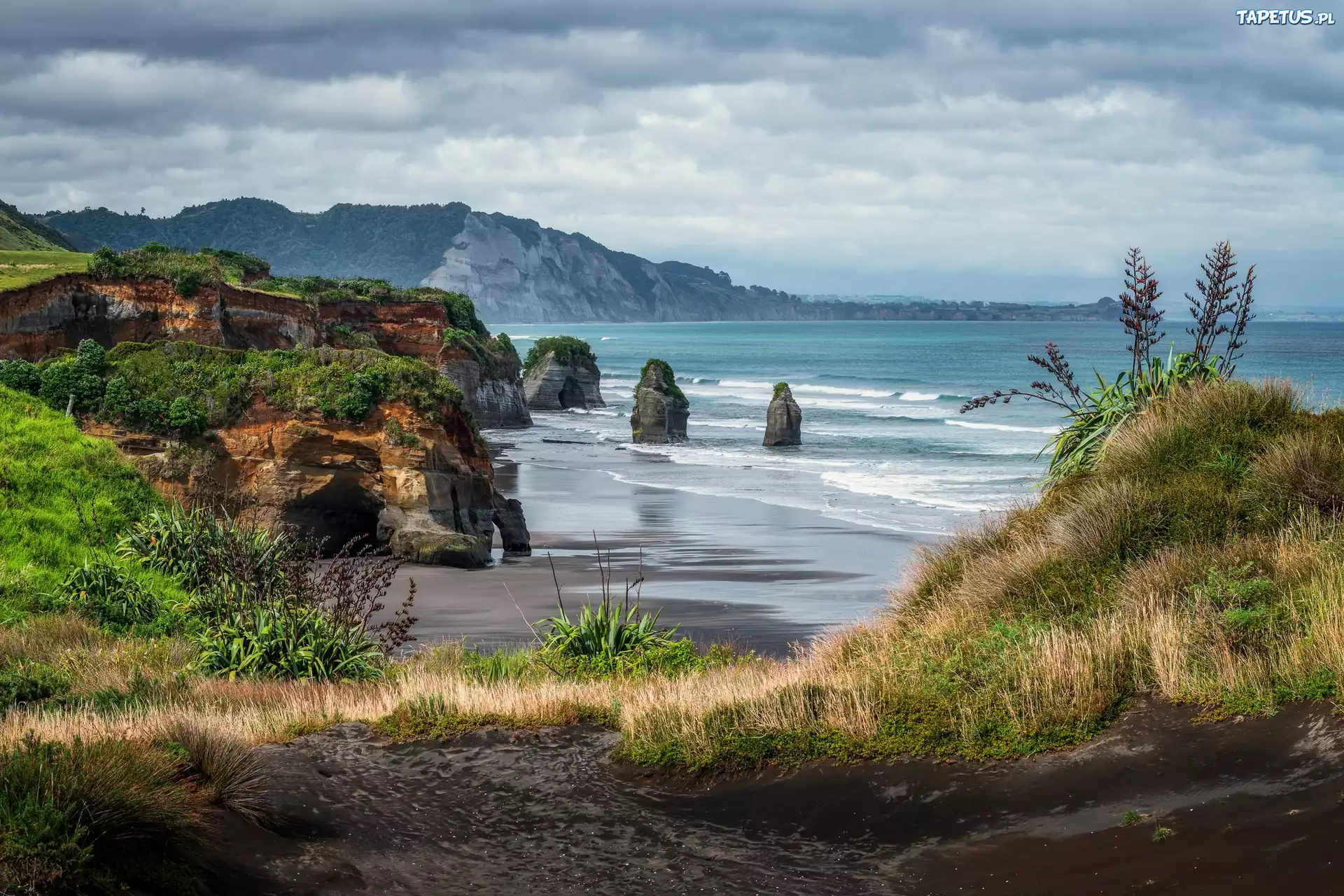 Tapeta Morze, Wybrzeże, Skały, Plaża, Drzewa, Roślinność, Chmury