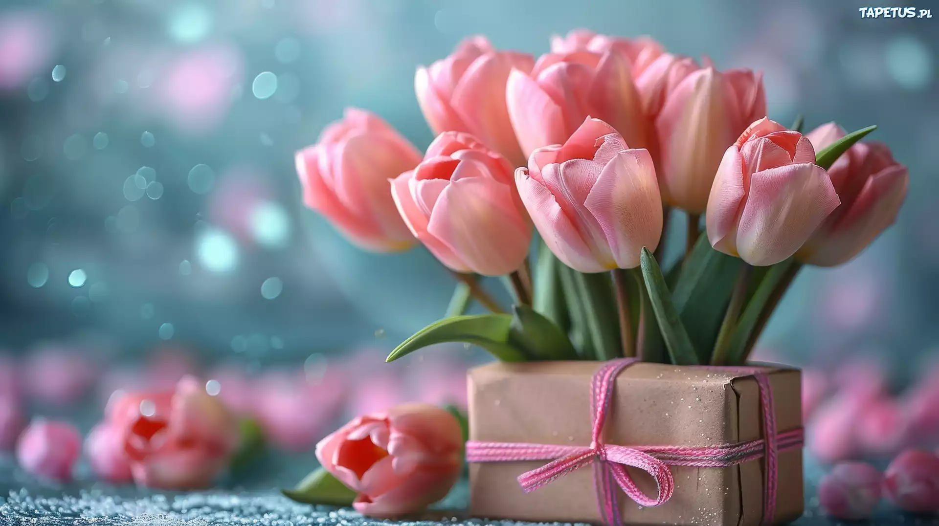 Tapeta Kwiaty, Różowe, Tulipany, Prezent, Wstążka