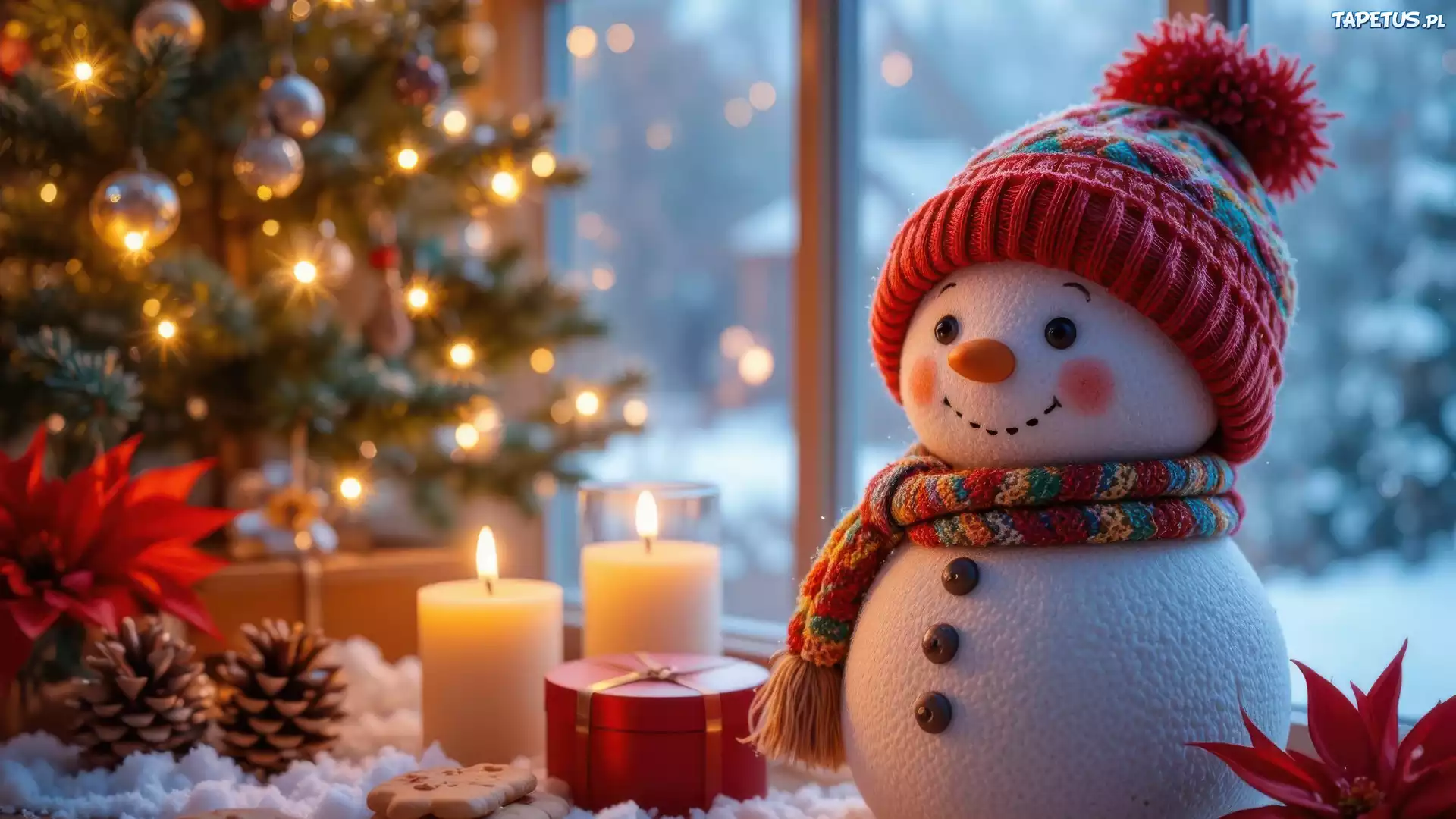 Tapeta Świąteczne, Bałwanek, Okno, Choinka, Świece