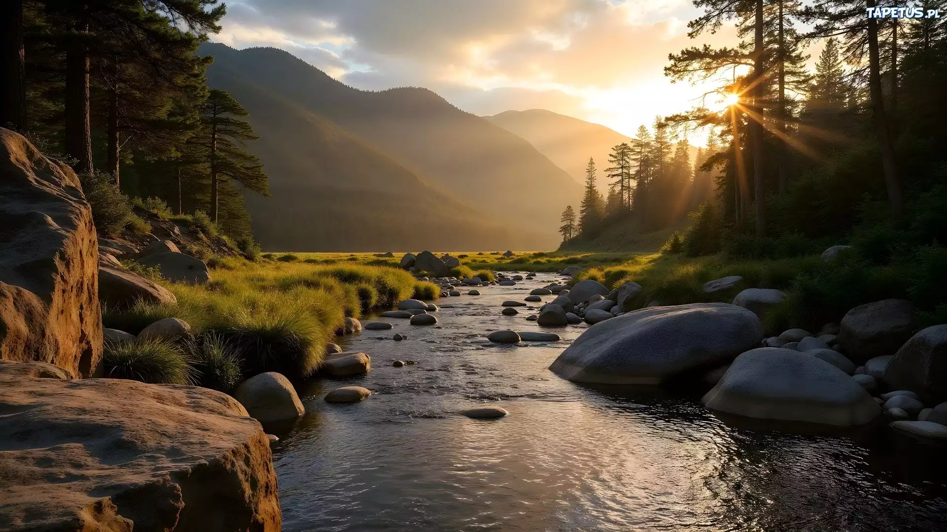 Tapeta Rzeka, Kamienie, Drzewa, Góry, Promienie słońca, Grafika AI