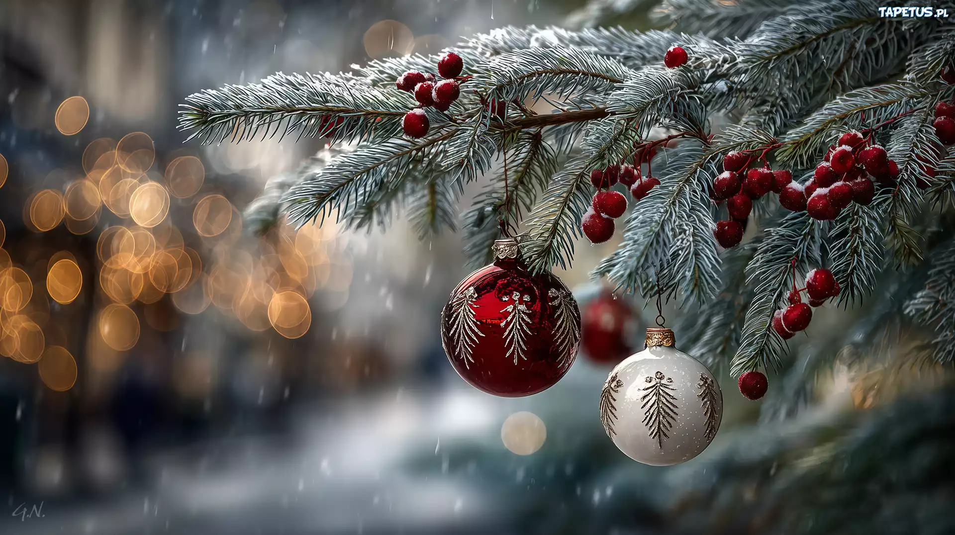 Tapeta Boże Narodzenie, Świerk, Bombki, Grafika AI
